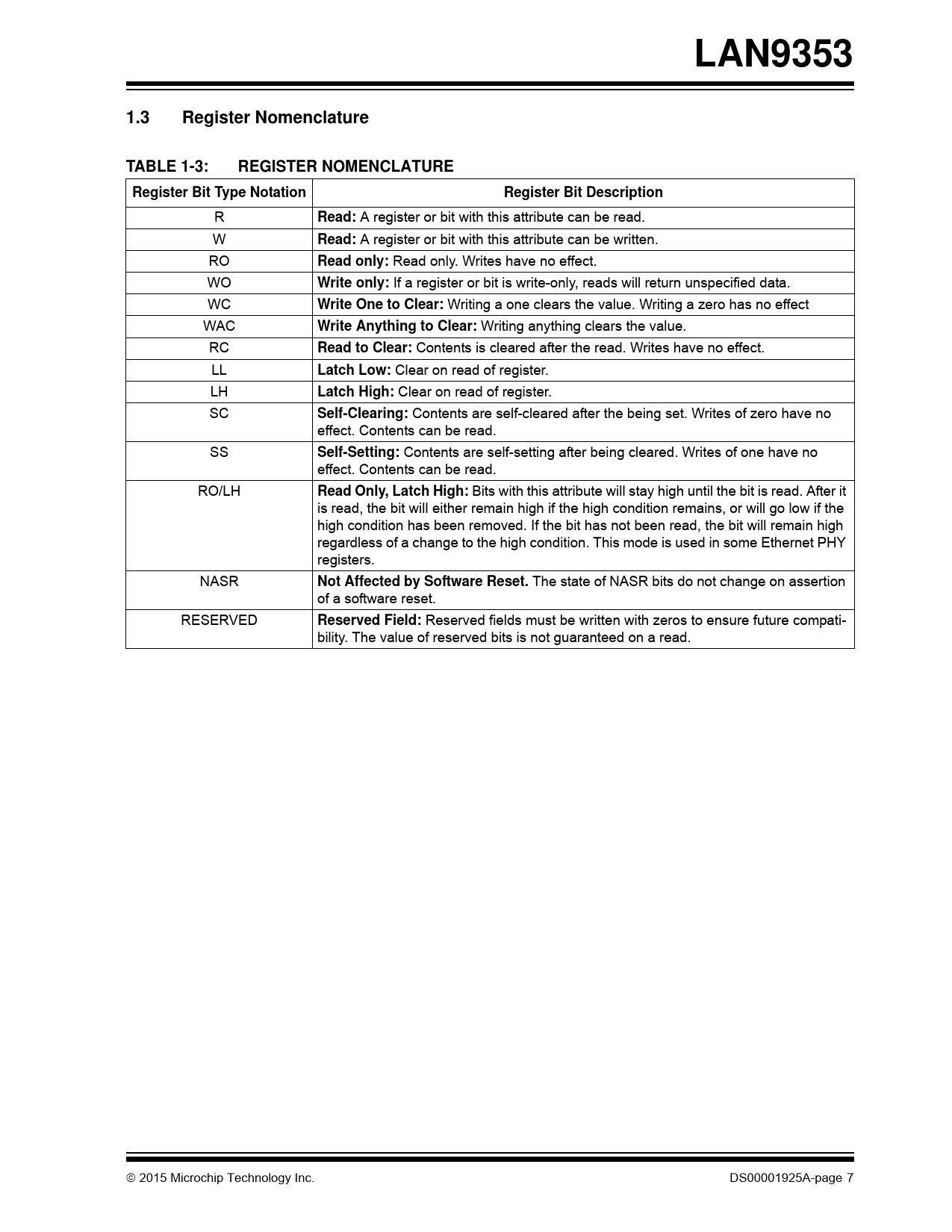 LAN9353. 1.3. Register Nomenclature. TABLE 1-3:. REGISTER NOMENCLATURE. Register Bit Type Notation. Register Bit Description. Read: