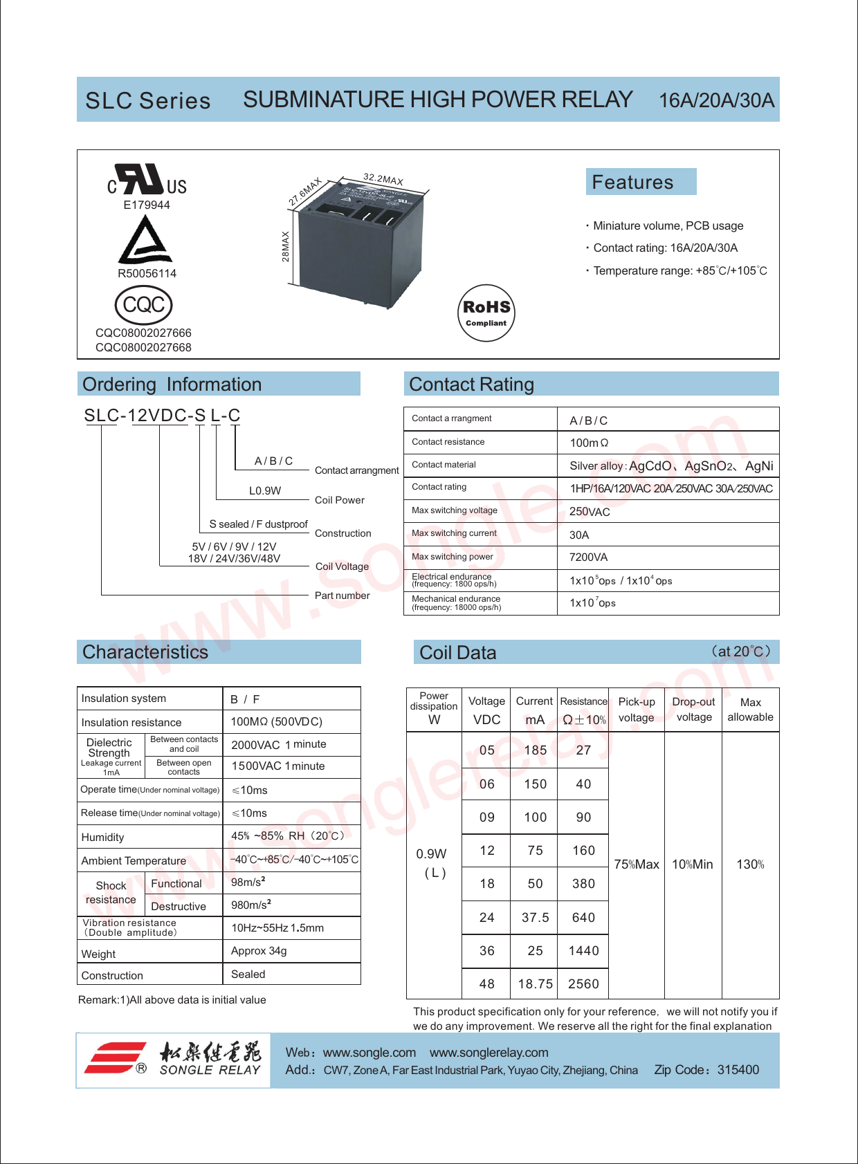SLC Series SUBMINATURE HIGH POWER RELAY 16A/20A/30A C US 32.2MAX AX Features E179944 27.6M ·Miniature volume, PCB usage X A M ·Contact rating: 16A/20A/30A 8 2 ·Temperature range: +85℃/+105℃ R50056114 CQC CQC08002027666 CQC08002027668 Ordering Information Contact Rating SLC-12VDC-S L-C Contact a rrangment A / B / C Contact resistance 100mΩ A / B / C Contact material Silver alloy:AgCdO、AgSnO2、AgNi Contact arrangment Contact rating 1HP/16A/120VAC 20A/250VAC 30 L0.9W A/250VAC Coil Power Max switching voltage 250VAC S sealed / F dustproof Construction Max switching current 30A 5V / 6V / 9V / 12V 18V / 24V/36V/48V Max switching power 7200VA Coil Voltage Electrical endurance (frequency: 1800 ops/h) 1x10 5ops / 1x10 4 ops Part number 7 endurance Mechanical 1x10 ops (frequency: 18000 ops/h) Characteristics Coil Data ( 20 at ℃) Insulation system B / F Power Voltage Current Resistance dissipation Pick-up Drop-out Max Insulation resistance 100MΩ (500VDC) W VDC mA ± Ω 10% voltage voltage allowable Dielectric Between contacts 2000VAC 1 minute Strength and coil 05 185 27 Leakage current Between open 1500VAC 1 minute 1mA contacts 06 150 40 Operate time(Under nominal voltage) ≤10ms Release time(Under nominal voltage) ≤10ms 09 100 90 Humidity 45% ~85% RH(20℃) 12 75 160 - 0.9W Ambient Temperature 40℃~+85℃/-40℃~+105℃ 75%Max 10%Min 130% ( L ) Functional 98m/s ² Shock 18 50 380 resistance Destructive 980m/s ² 24 37.5 640 Vibration resistance 10Hz ~ 55Hz 1 . 5mm ( Double amplitude) Approx 34g 36 25 1440 Weight Construction Sealed 48 18.75 2560 Remark:1)All above data is initial value This product specification only for your reference, we will not notify you if we do any improvement.We reserve all the right for the final explanation Web:www.songle.com www.songlerelay.com Email:sale@songle.com Web:www.songle.com www.songlerelay.com Add.:CW7, Zone A, Far East Industrial Park, Yuyao City, Zhejiang, China i Z p Code:315400 Add.:CW7, Zone A, Far East Industrial Park, Yuyao City, Zhejiang, China Zip Code:315400 Tel.: +86 574 62717777 62762658 62721968 a F x:+86 574 62721978 Document Outline 页 1 页 2