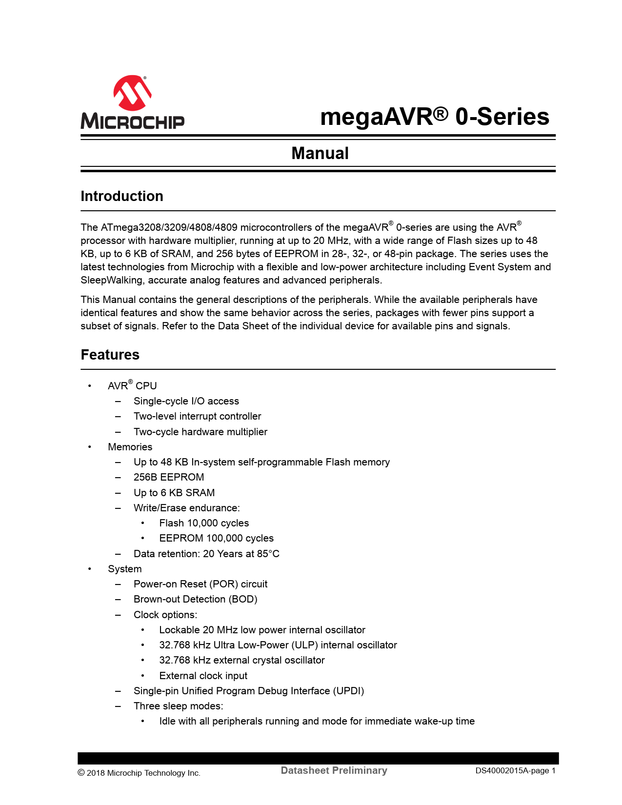 megaAVR® 0-Series. Manual. Introduction. Features. Datasheet Preliminary