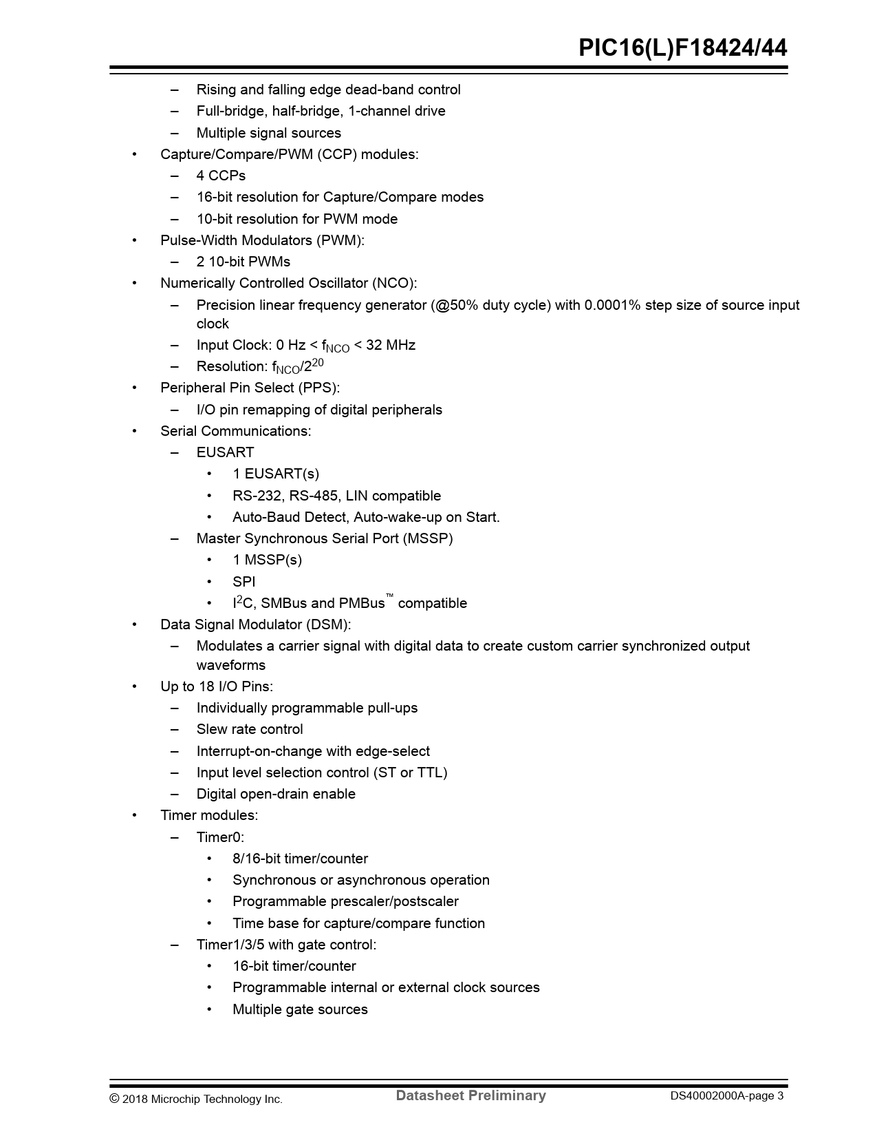 – Rising and falling edge dead-band control – Full-bridge, half-bridge, 1-channel drive – Multiple signal sources • Capture/Compare/PWM (CCP) modules: – 4 CCPs – 16-bit resolution for Capture/Compare modes – 10-bit resolution for PWM mode • Pulse-Width Modulators (PWM): – 2 10-bit PWMs • Numerically Controlled Oscillator (NCO): – Precision linear frequency generator (@50% duty cycle) with 0.0001% step size of source input clock – Input Clock: 0 Hz < fNCO < 32 MHz – Resolution: fNCO/220 • Peripheral Pin Select (PPS): – I/O pin remapping of digital peripherals • Serial Communications: – EUSART • 1 EUSART(s) • RS-232, RS-485, LIN compatible • Auto-Baud Detect, Auto-wake-up on Start. – Master Synchronous Serial Port (MSSP) • 1 MSSP(s) • SPI • I2C, SMBus and PMBus™ compatible • Data Signal Modulator (DSM): – Modulates a carrier signal with digital data to create custom carrier synchronized output waveforms • Up to 18 I/O Pins: – Individually programmable pull-ups – Slew rate control – Interrupt-on-change with edge-select – Input level selection control (ST or TTL) – Digital open-drain enable • Timer modules: – Timer0: • 8/16-bit timer/counter • Synchronous or asynchronous operation • Programmable prescaler/postscaler • Time base for capture/compare function – Timer1/3/5 with gate control: • 16-bit timer/counter • Programmable internal or external clock sources • Multiple gate sources © 2018 Microchip Technology Inc.