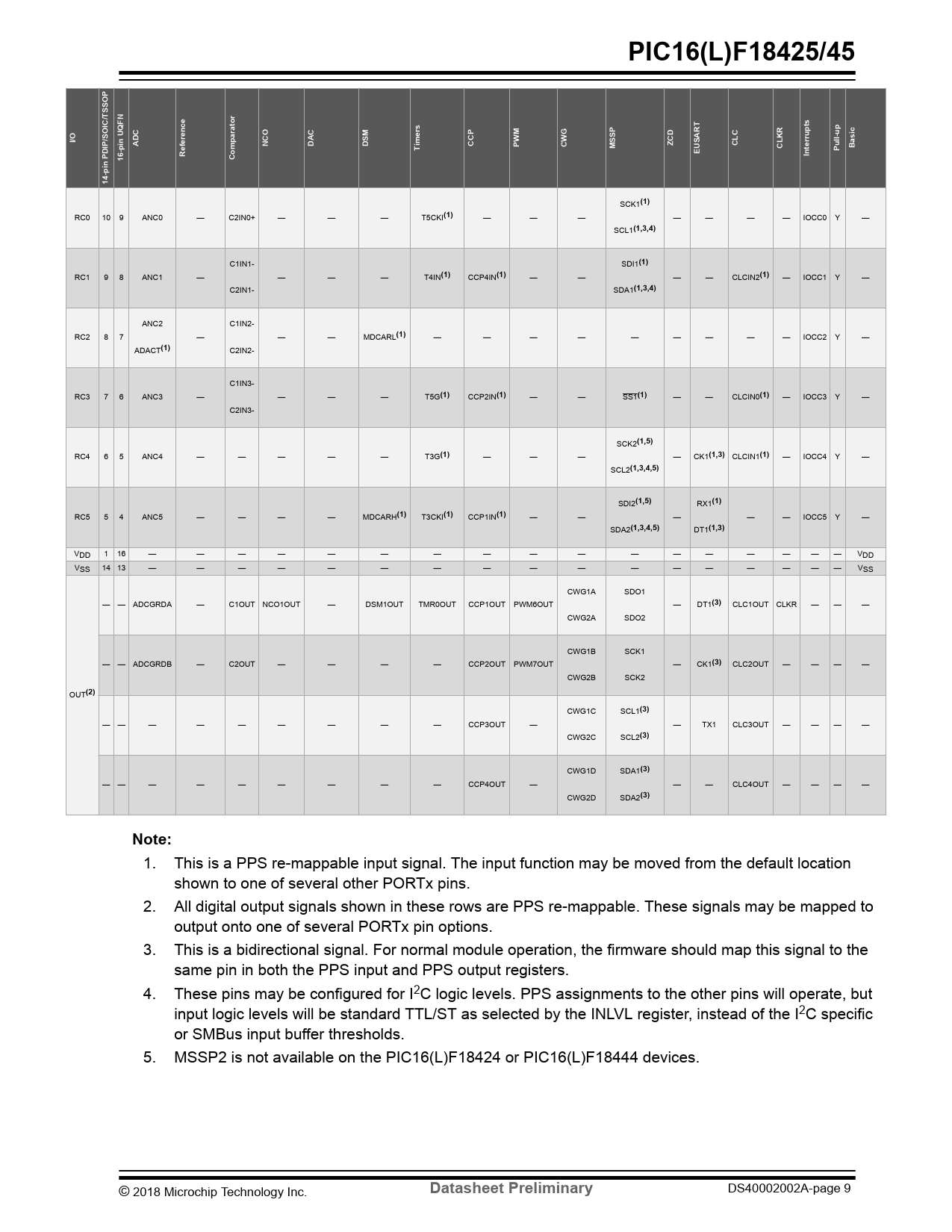 1. This is a PPS re-mappable input signal. The input function may be moved from the default location shown to one of several other PORTx pins. 2. All digital output signals shown in these rows are PPS re-mappable. These signals may be mapped to output onto one of several PORTx pin options. 3. This is a bidirectional signal. For normal module operation, the firmware should map this signal to the same pin in both the PPS input and PPS output registers. 4. These pins may be configured for I2C logic levels. PPS assignments to the other pins will operate, but input logic levels will be standard TTL/ST as selected by the INLVL register, instead of the I2C specific or SMBus input buffer thresholds. 5. MSSP2 is not available on the PIC16(L)F18424 or PIC16(L)F18444 devices. © 2018 Microchip Technology Inc.