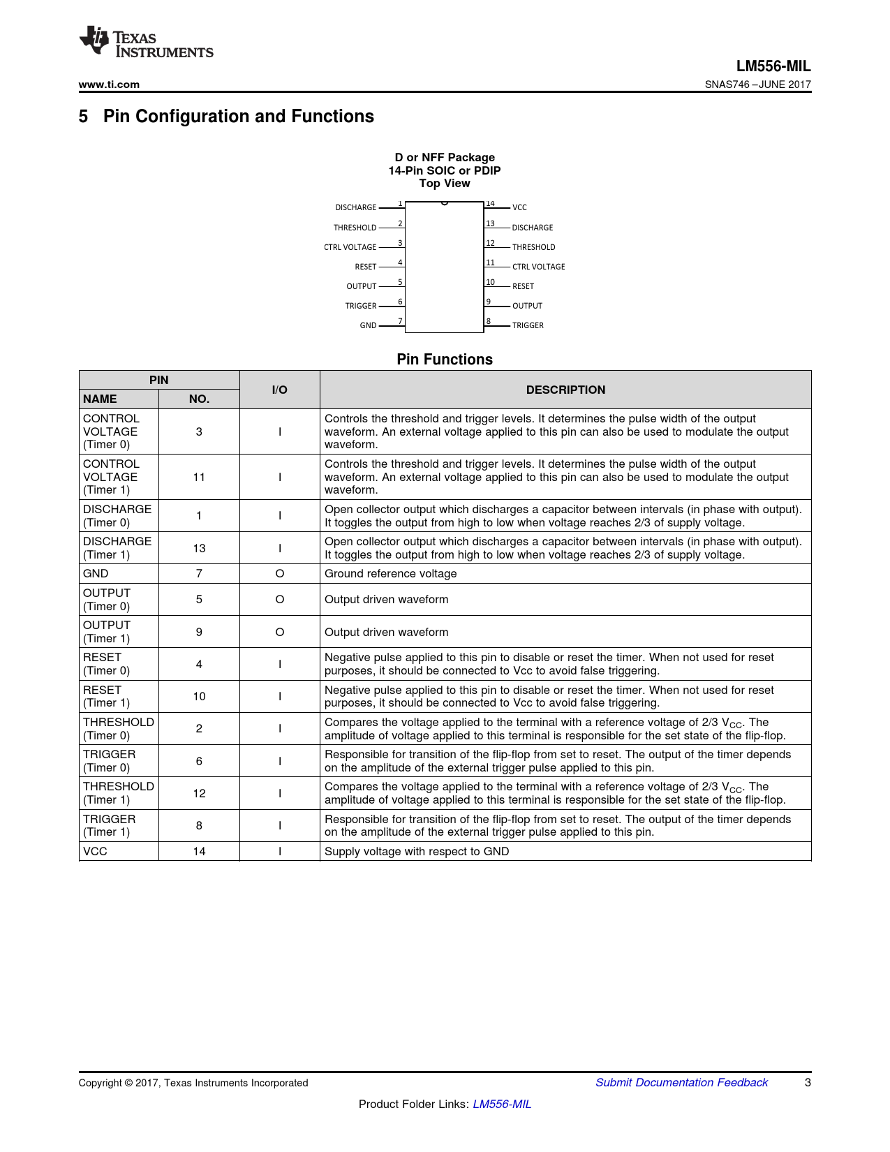 LM556-MIL. www.ti.com. 5 Pin Configuration and Functions. D or NFF Package. 14-Pin SOIC or PDIP. Top View. Pin Functions. PIN. I/O