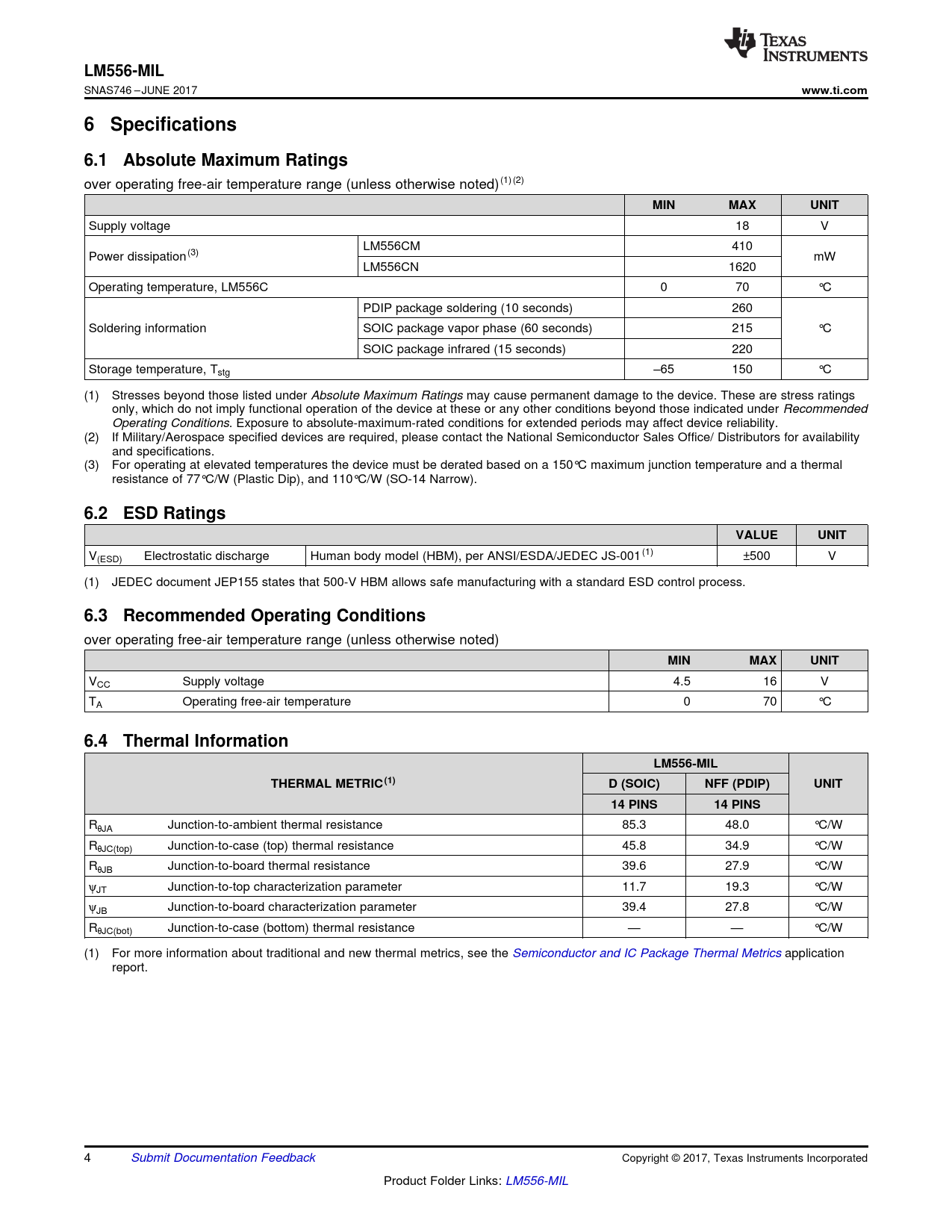 LM556-MIL. www.ti.com. 6 Specifications. 6.1 Absolute Maximum Ratings. MIN. MAX. UNIT. 6.2 ESD Ratings. VALUE