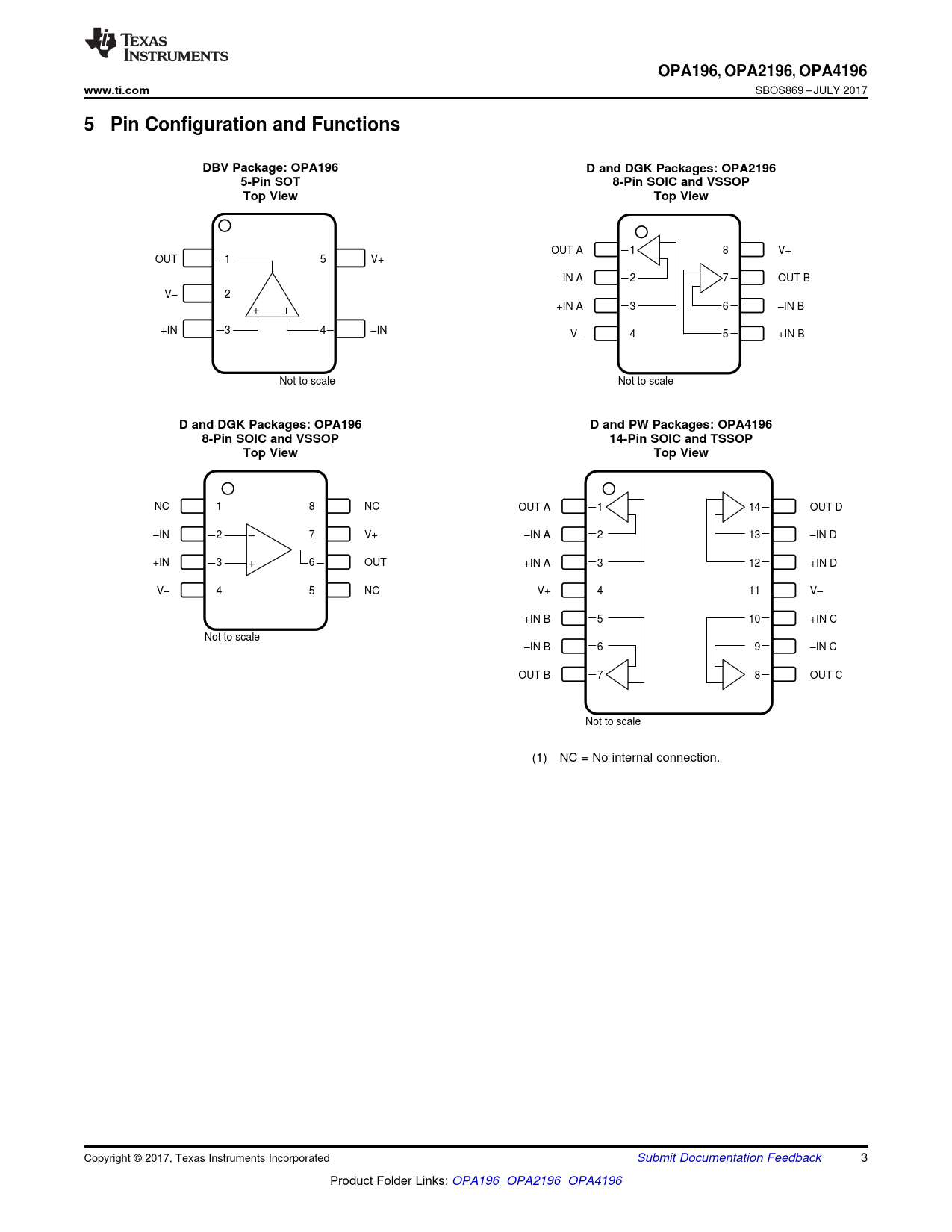 | Páginas / Página | 49 / 3 — OPA196. , OPA2196. , OPA4196. www.ti.com. 5 Pin Configuration and … |