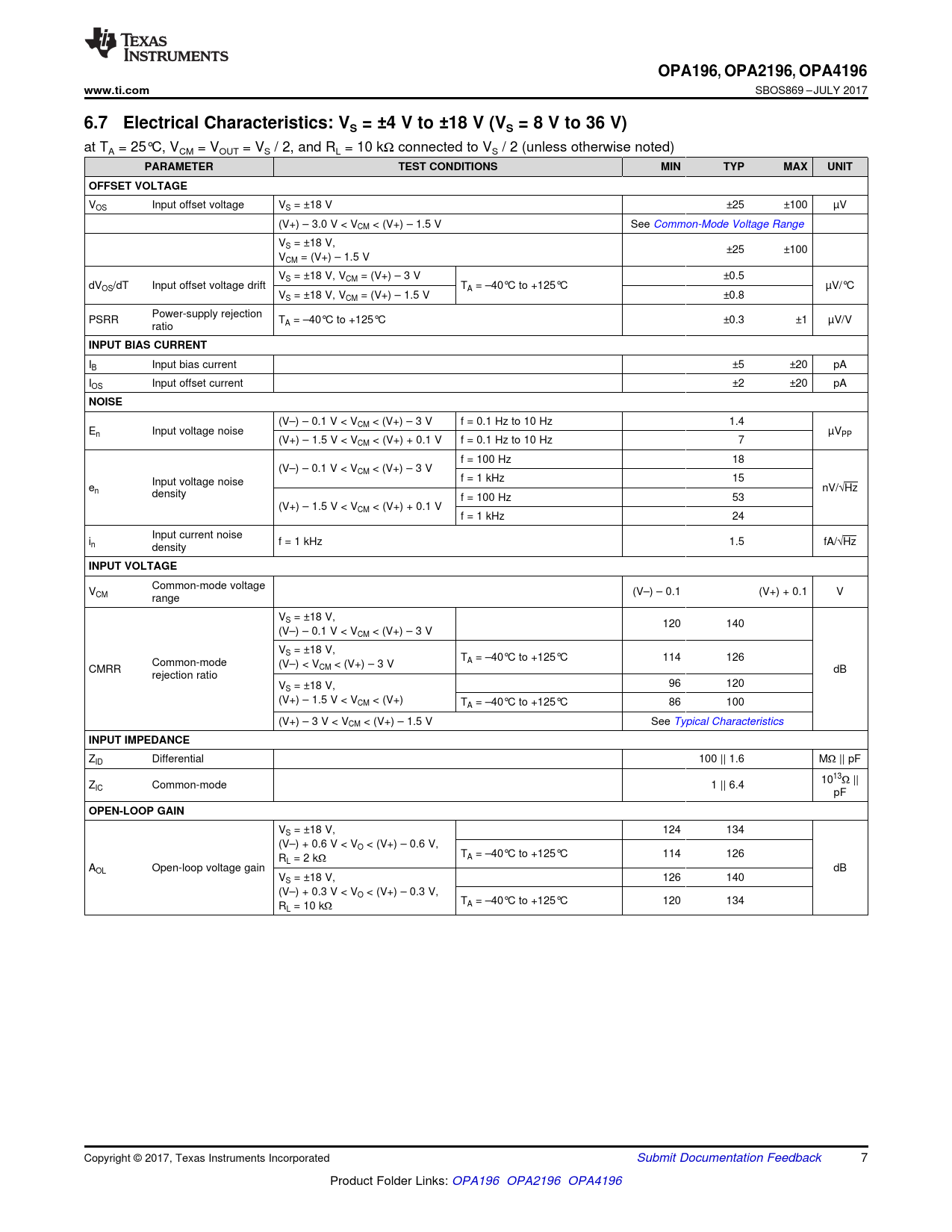 OPA196. , OPA2196. , OPA4196. www.ti.com. 6.7 Electrical Characteristics: VS = ±4 V to ±18 V (VS = 8 V to 36 V). PARAMETER