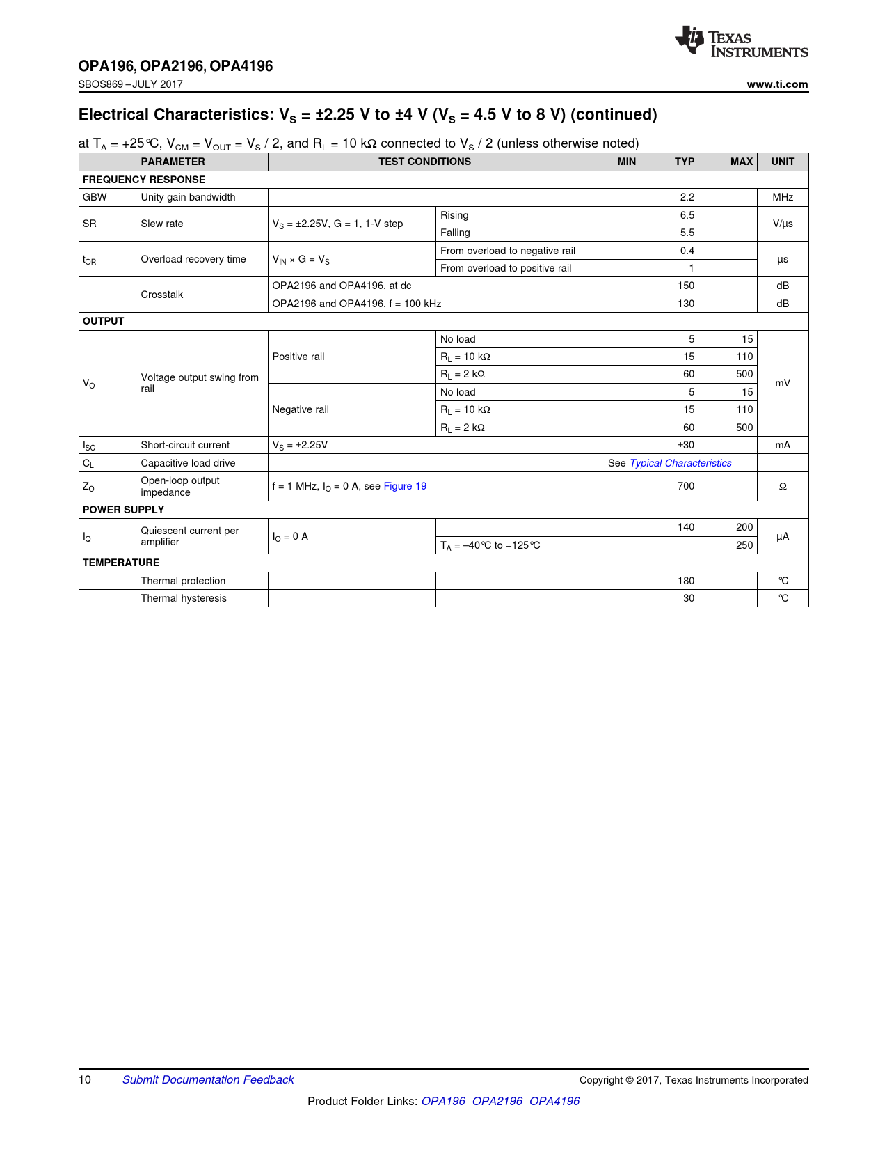 OPA196. , OPA2196,. OPA4196. www.ti.com. Electrical Characteristics: VS = ±2.25 V to ±4 V (VS = 4.5 V to 8 V) (continued)