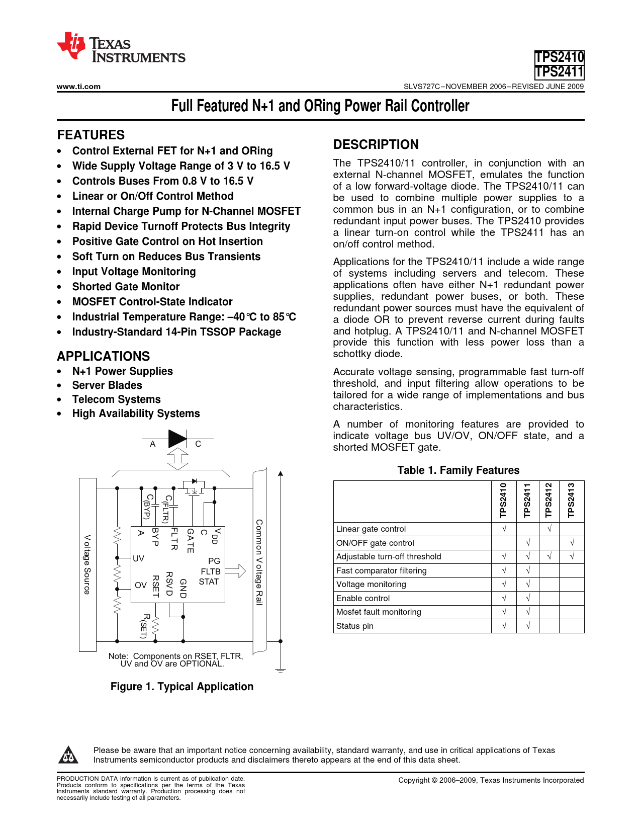 TPS2410. TPS2411. www.ti.com. Full Featured N+1 and ORing Power Rail Controller. FEATURES. DESCRIPTION