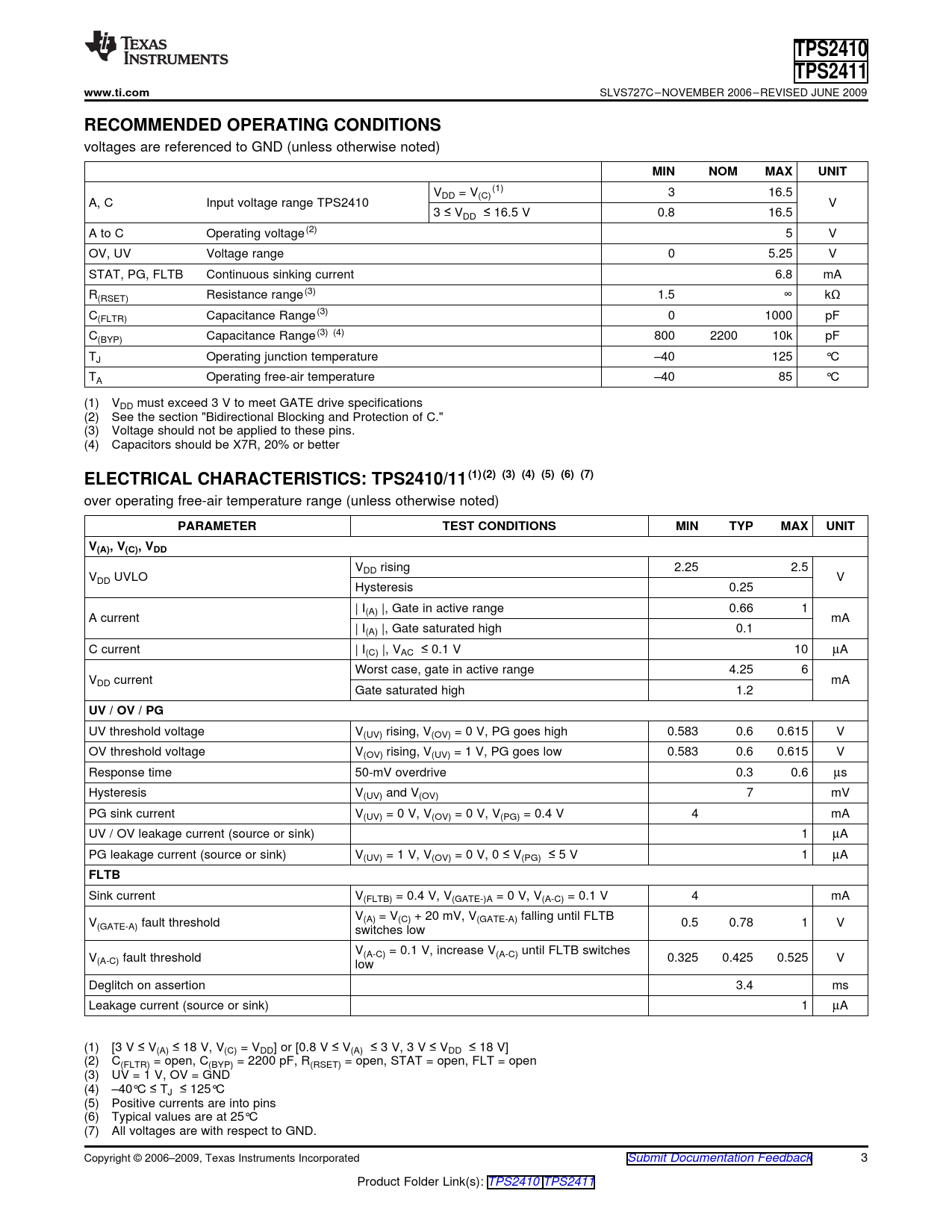 TPS2410. TPS2411. www.ti.com. RECOMMENDED OPERATING CONDITIONS. MIN. NOM. MAX. UNIT