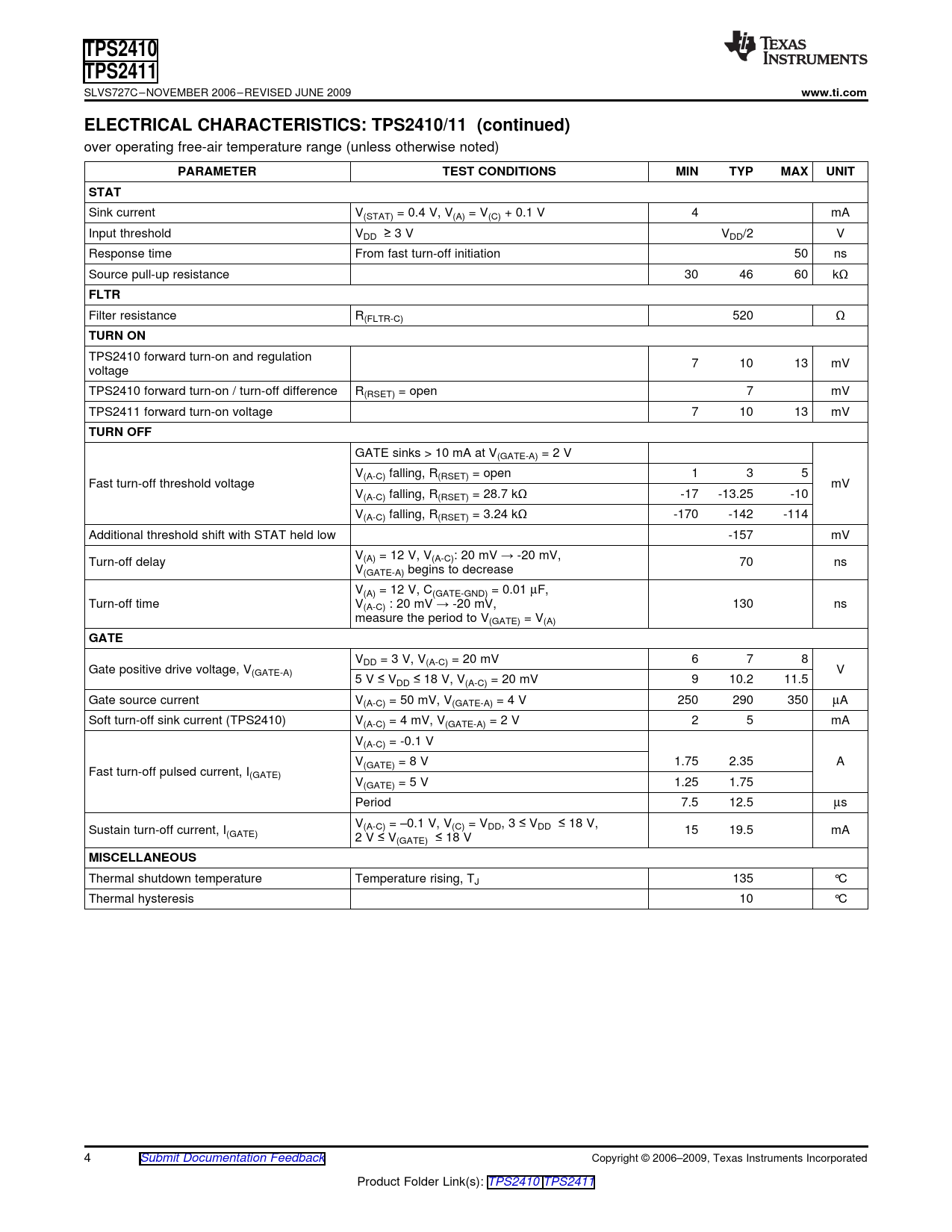 TPS2410. TPS2411. www.ti.com. ELECTRICAL CHARACTERISTICS: TPS2410/11 (continued). PARAMETER. TEST CONDITIONS. MIN. TYP. MAX. UNIT. STAT. FLTR
