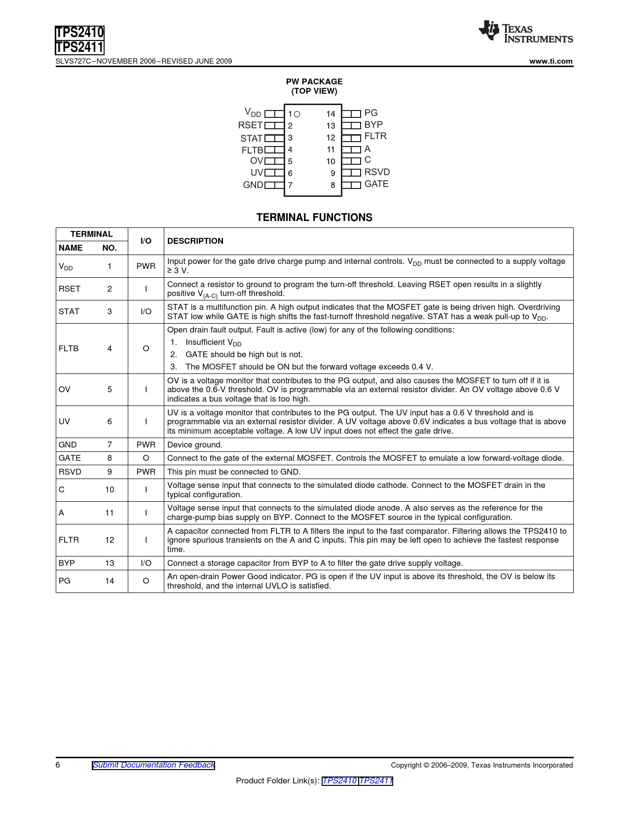 TPS2410. TPS2411. www.ti.com. PW PACKAGE. (TOP VIEW). TERMINAL FUNCTIONS. TERMINAL. I/O. DESCRIPTION. NAME. NO