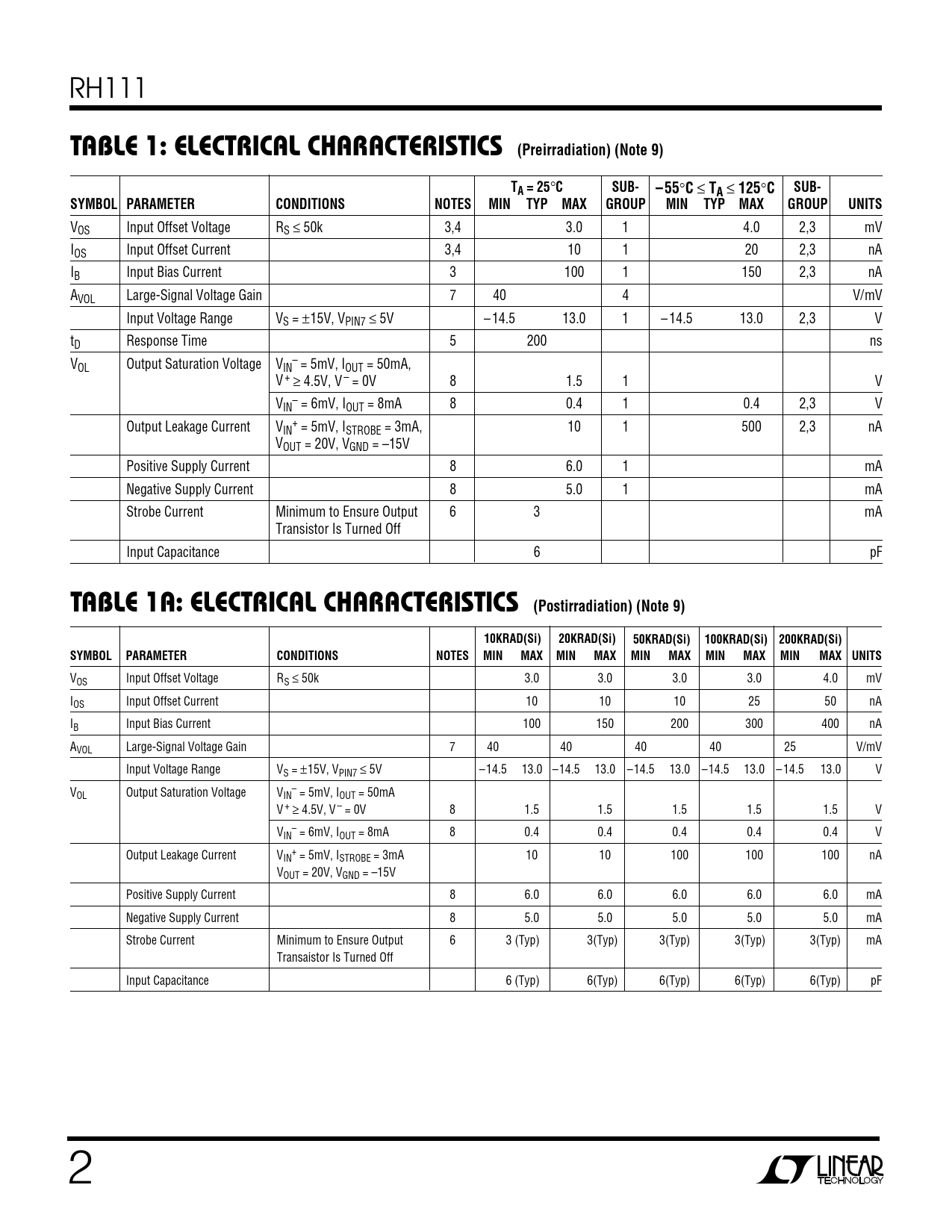 TABLE 1: ELECTRICAL CHARACTERISTICS (Preirradiation) (Note 9) TA = 25