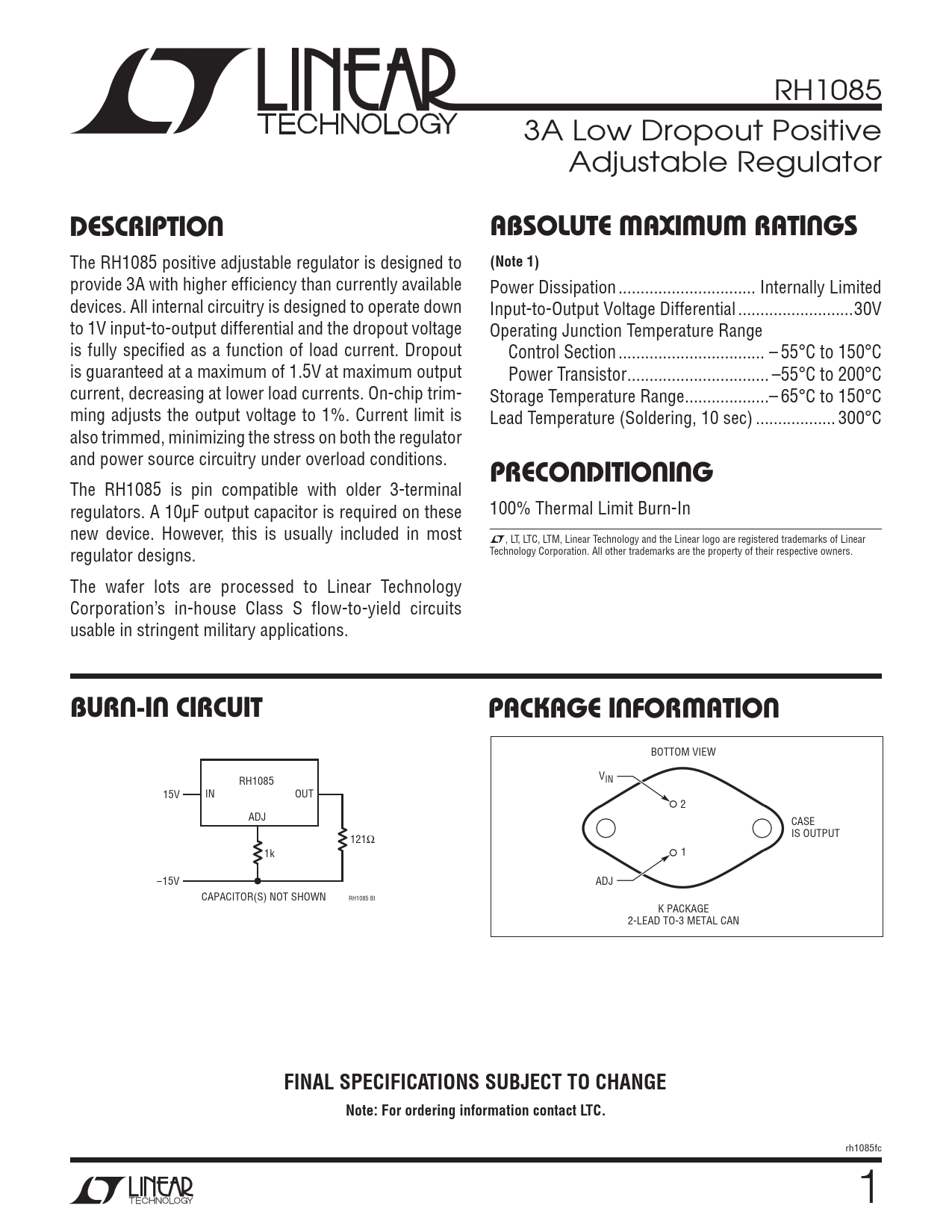 The RH1085 is pin compatible with older 3-terminal regulators. A 10μF output capacitor is required on these 100% Thermal Limit Burn-In new device. However, this is usually included in most L, LT, LTC, LTM, Linear Technology and the Linear logo are registered trademarks of Linear regulator designs. Technology Corporation. All other trademarks are the property of their respective owners. The wafer lots are processed to Linear Technology Corporation’s in-house Class S flow-to-yield circuits usable in stringent military applications.