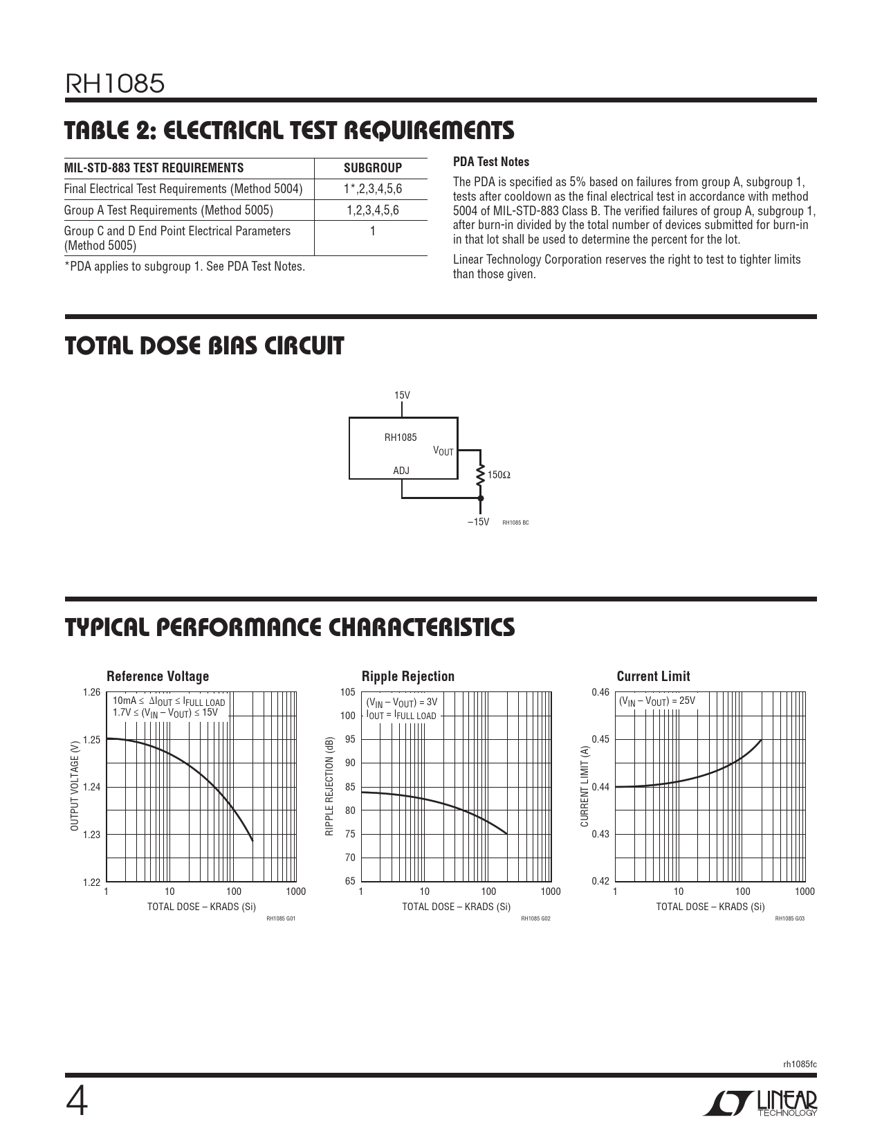 RH1085 TABLE 2: ELECTRICAL TEST REQUIREMENTSMIL-STD-883 TEST REQUIREMENTSSUBGROUPPDA Test Notes The PDA is specified as 5% based on failures from group A, subgroup 1, Final Electrical Test Requirements (Method 5004) 1*,2,3,4,5,6 tests after cooldown as the final electrical test in accordance with method Group A Test Requirements (Method 5005) 1,2,3,4,5,6 5004 of MIL-STD-883 Class B. The verified failures of group A, subgroup 1, Group C and D End Point Electrical Parameters 1 after burn-in divided by the total number of devices submitted for burn-in (Method 5005) in that lot shall be used to determine the percent for the lot. Linear Technology Corporation reserves the right to test to tighter limits *PDA applies to subgroup 1. See PDA Test Notes. than those given. TOTAL DOSE BIAS CIRCUIT 15V RH1085 VOUT ADJ 150Ω –15V RH1085 BC TYPICAL PERFORMANCE CHARACTERISTICSReference VoltageRipple RejectionCurrent Limit 1.26 105 0.46 10mA ≤ ΔIOUT ≤ IFULL LOAD (V (V IN – VOUT) = 3V IN – VOUT) = 25V 1.7V ≤ (VIN – VOUT) ≤ 15V 100 IOUT = IFULL LOAD 1.25 95 0.45 90 1.24 85 0.44 80 OUTPUT VOLTAGE (V) CURRENT LIMIT (A) 1.23 RIPPLE REJECTION (dB) 75 0.43 70 1.22 65 0.42 1 10 100 1000 1 10 100 1000 1 10 100 1000 TOTAL DOSE – KRADS (Si) TOTAL DOSE – KRADS (Si) TOTAL DOSE – KRADS (Si) RH1085 G01 RH1085 G02 RH1085 G03 rh1085fc 4