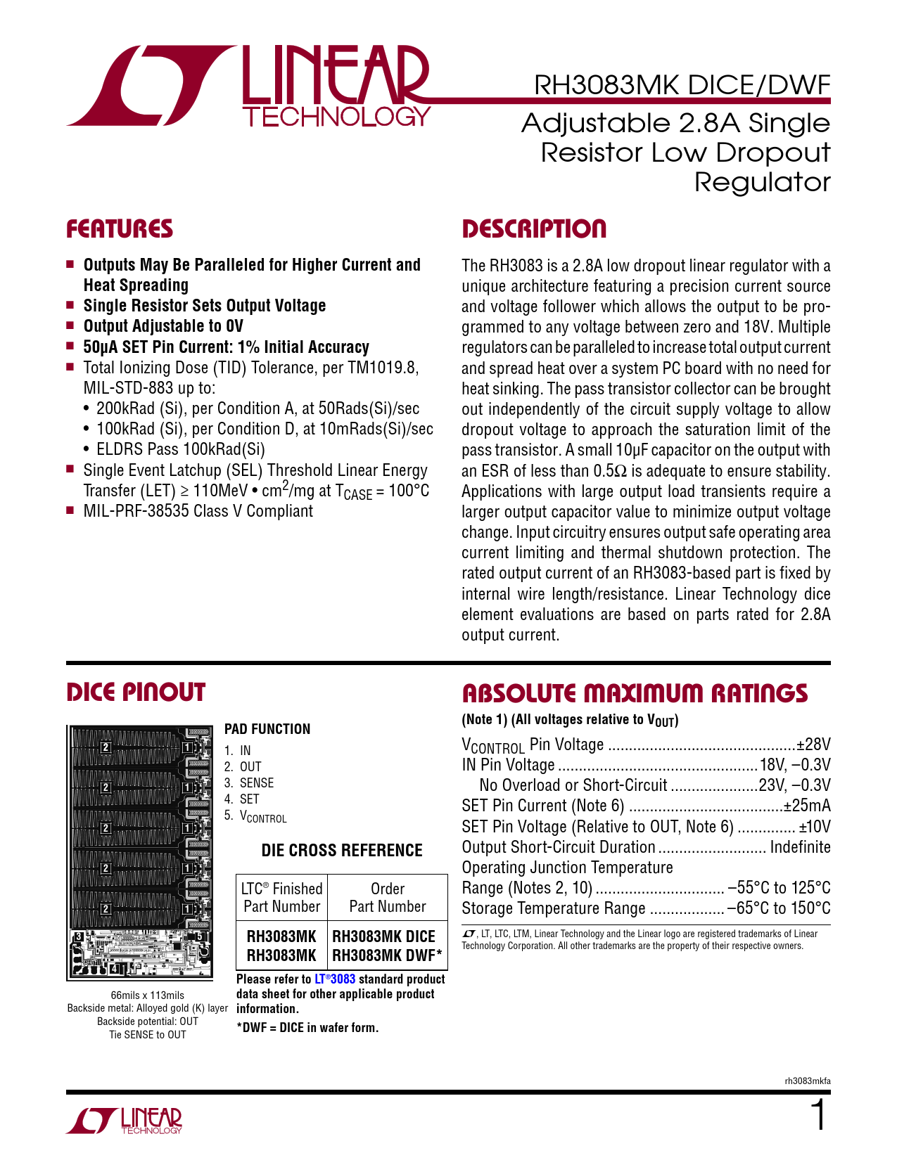 Tie SENSE to OUT rh3083mkfa 1 Document Outline Features Description Dice Pinout Absolute Maximum Ratings Table 1. DICE/DWF Electrical Test Limits Table 2. Electrical Characteristics Table 3. Electrical Characteristics Table 4. Electrical Test Requirements Total Dose Bias Circuit Burn-In Circuit Typical Performance Characteristics Revision History