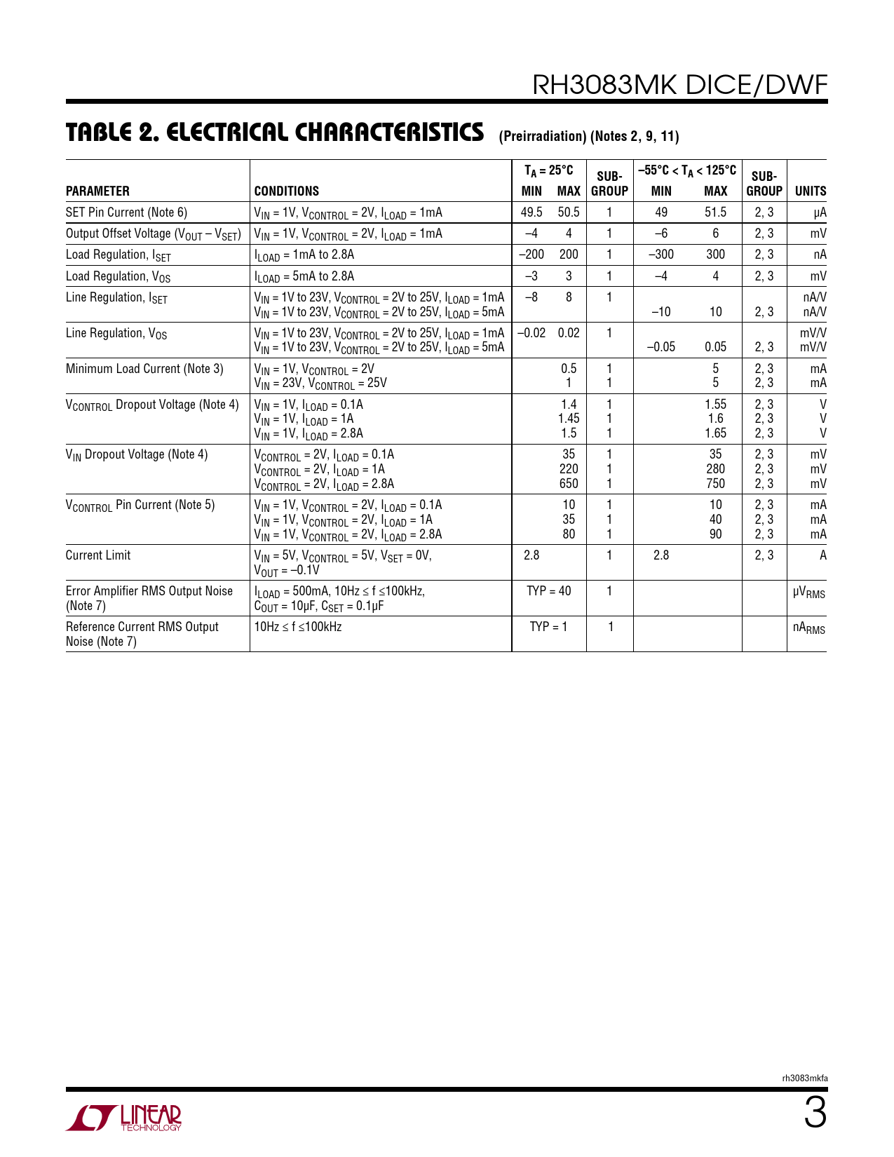 table 2. electrical characteristics (Preirradiation) (Notes 2, 9, 11) TA = 25°C SUB- –55°C < TA < 125°C SUB- PARAMETER CONDITIONS MIN MAX GROUP MIN MAX GROUP UNITS