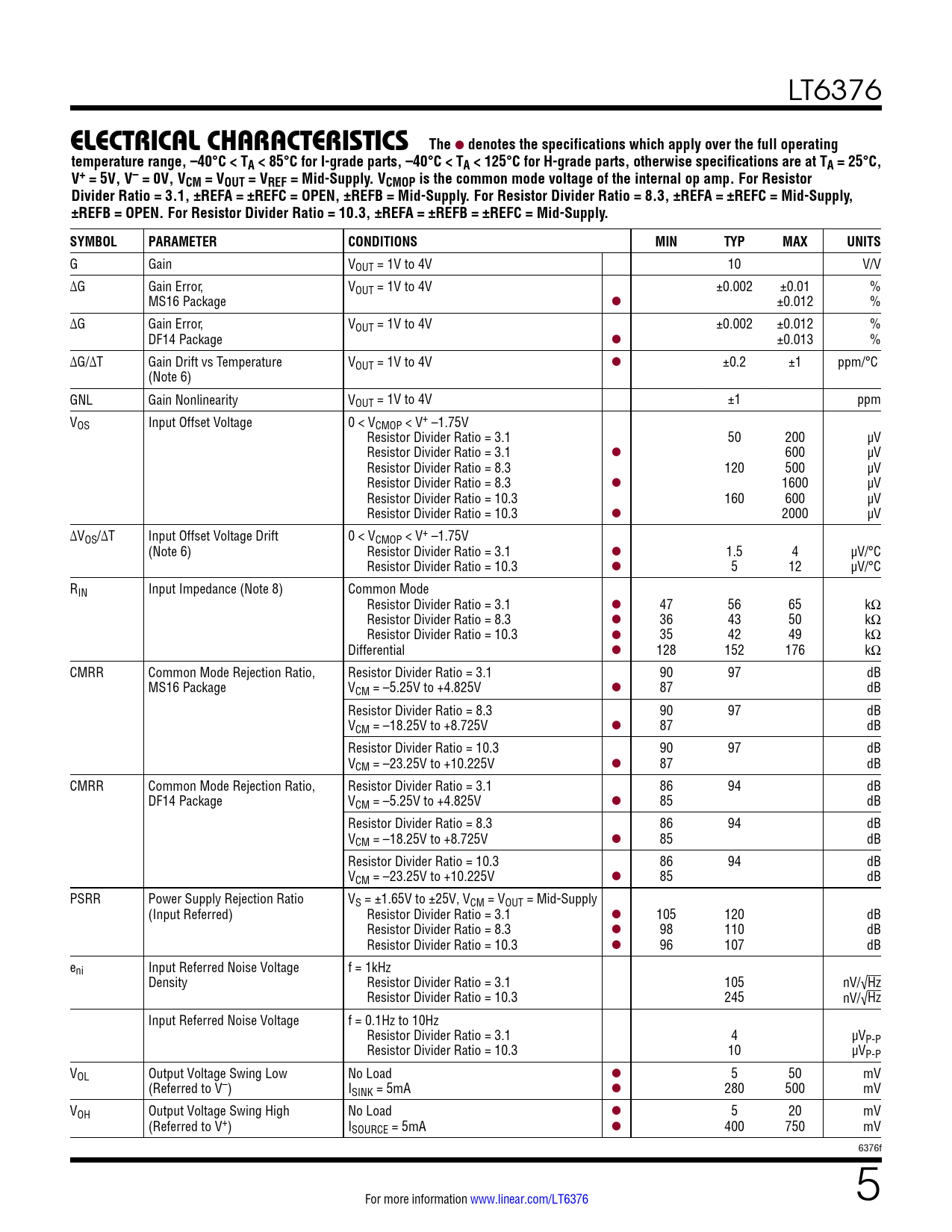 denotes the specifications which apply over the full operating temperature range, –40°C < TA < 85°C for I-grade parts, –40°C < TA < 125°C for H-grade parts, otherwise specifications are at TA = 25°C, V+ = 5V, V– = 0V, VCM = VOUT = VREF = Mid-Supply. VCMOP is the common mode voltage of the internal op amp. For Resistor Divider Ratio = 3.1, ±REFA = ±REFC = OPEN, ±REFB = Mid-Supply. For Resistor Divider Ratio = 8.3, ±REFA = ±REFC = Mid-Supply, ±REFB = OPEN. For Resistor Divider Ratio = 10.3, ±REFA = ±REFB = ±REFC = Mid-Supply. SYMBOL PARAMETER CONDITIONS MIN TYP MAX UNITS