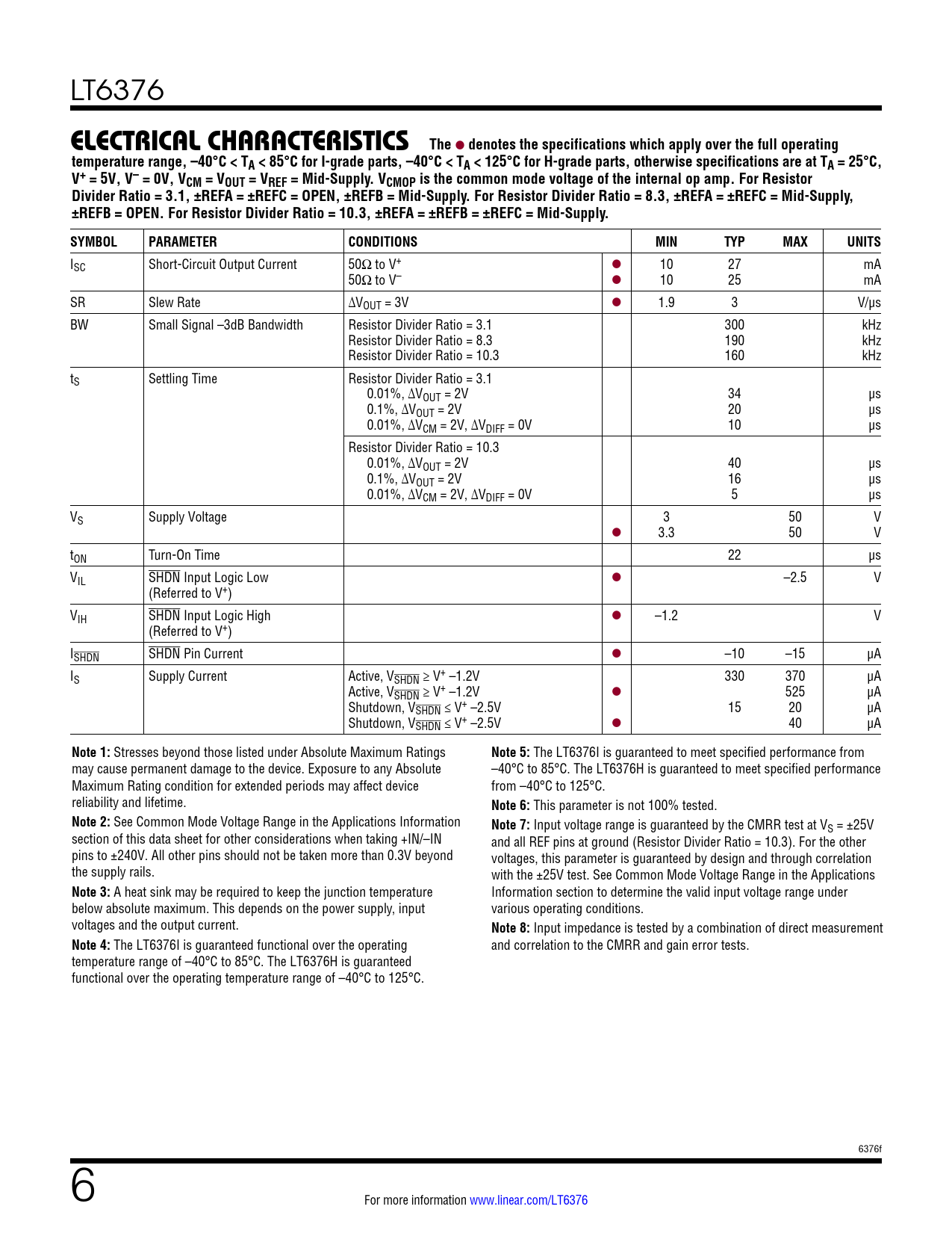 LT6376 ELECTRICAL CHARACTERISTICSThe l denotes the specifications which apply over the full operatingtemperature range, –40°C < TA < 85°C for I-grade parts, –40°C < TA < 125°C for H-grade parts, otherwise specifications are at TA = 25°C,V+ = 5V, V– = 0V, VCM = VOUT = VREF = Mid-Supply. VCMOP is the common mode voltage of the internal op amp. For ResistorDivider Ratio = 3.1, ±REFA = ±REFC = OPEN, ±REFB = Mid-Supply. For Resistor Divider Ratio = 8.3, ±REFA = ±REFC = Mid-Supply,±REFB = OPEN. For Resistor Divider Ratio = 10.3, ±REFA = ±REFB = ±REFC = Mid-Supply.SYMBOLPARAMETERCONDITIONSMINTYPMAXUNITS ISC Short-Circuit Output Current 50Ω to V+ l 10 27 mA 50Ω to V– l 10 25 mA SR Slew Rate ∆VOUT = 3V l 1.9 3 V/µs BW Small Signal –3dB Bandwidth Resistor Divider Ratio = 3.1 300 kHz Resistor Divider Ratio = 8.3 190 kHz Resistor Divider Ratio = 10.3 160 kHz tS Settling Time Resistor Divider Ratio = 3.1 0.01%, ∆VOUT = 2V 34 µs 0.1%, ∆VOUT = 2V 20 µs 0.01%, ∆VCM = 2V, ∆VDIFF = 0V 10 µs Resistor Divider Ratio = 10.3 0.01%, ∆VOUT = 2V 40 µs 0.1%, ∆VOUT = 2V 16 µs 0.01%, ∆VCM = 2V, ∆VDIFF = 0V 5 µs VS Supply Voltage 3 50 V l 3.3 50 V tON Turn-On Time 22 µs VIL SHDN Input Logic Low l –2.5 V (Referred to V+) VIH SHDN Input Logic High l –1.2 V (Referred to V+) ISHDN SHDN Pin Current l –10 –15 µA IS Supply Current Active, VSHDN ≥ V+ –1.2V 330 370 µA Active, VSHDN ≥ V+ –1.2V l 525 µA Shutdown, VSHDN ≤ V+ –2.5V 15 20 µA Shutdown, VSHDN ≤ V+ –2.5V l 40 µA Note 1: Stresses beyond those listed under Absolute Maximum Ratings Note 5: The LT6376I is guaranteed to meet specified performance from may cause permanent damage to the device. Exposure to any Absolute –40°C to 85°C. The LT6376H is guaranteed to meet specified performance Maximum Rating condition for extended periods may affect device from –40°C to 125°C. reliability and lifetime. Note 6: This parameter is not 100% tested. Note 2: See Common Mode Voltage Range in the Applications Information Note 7: Input voltage range is guaranteed by the CMRR test at VS = ±25V section of this data sheet for other considerations when taking +IN/–IN and all REF pins at ground (Resistor Divider Ratio = 10.3). For the other pins to ±240V. All other pins should not be taken more than 0.3V beyond voltages, this parameter is guaranteed by design and through correlation the supply rails. with the ±25V test. See Common Mode Voltage Range in the Applications Note 3: A heat sink may be required to keep the junction temperature Information section to determine the valid input voltage range under below absolute maximum. This depends on the power supply, input various operating conditions. voltages and the output current. Note 8: Input impedance is tested by a combination of direct measurement Note 4: The LT6376I is guaranteed functional over the operating and correlation to the CMRR and gain error tests. temperature range of –40°C to 85°C. The LT6376H is guaranteed functional over the operating temperature range of –40°C to 125°C. 6376f 6 For more information www.linear.com/LT6376 Document Outline FEATURES DESCRIPTION APPLICATIONS TYPICAL APPLICATION ABSOLUTE MAXIMUM RATINGS PIN CONFIGURATION ORDER INFORMATION E LECTRICAL CHARACTERISTICS TYPICAL PERFORMANCE CHARACTERISTICS PIN FUNCTIONS BLOCK DIAGRAM APPLICATIONS INFORMATION TYPICAL APPLICATIONS PACKAGE DESCRIPTION TYPICAL APPLICATION RELATED PARTS