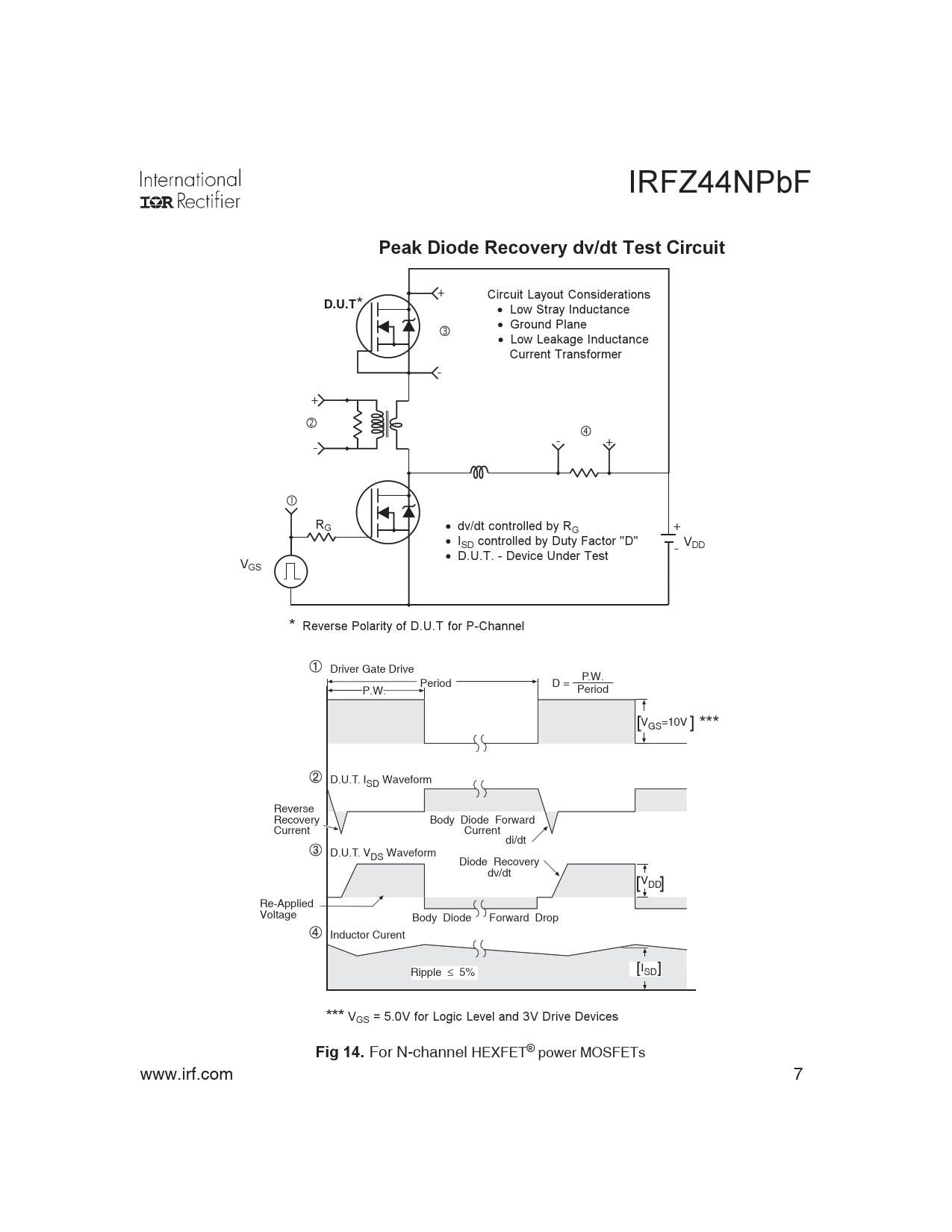 * Circuit Layout Considerations • Low Stray Inductance • Ground Plane • Low Leakage Inductance Current Transformer - + - + - RG • dv/dt controlled by R + G • ISD controlled by Duty Factor "D" - VDD • D.U.T. - Device Under Test VGS * Reverse Polarity of D.U.T for P-Channel Driver Gate Drive P.W. Period D = P.W. Period V [ GS=10V ] *** D.U.T. ISD Waveform Reverse Recovery Body Diode Forward Current Current di/dt D.U.T. VDS Waveform Diode Recovery dv/dt V [ DD ] Re-Applied Voltage Body Diode Forward Drop Inductor Curent Ripple ≤ 5% I [ SD ] *** VGS = 5.0V for Logic Level and 3V Drive Devices
