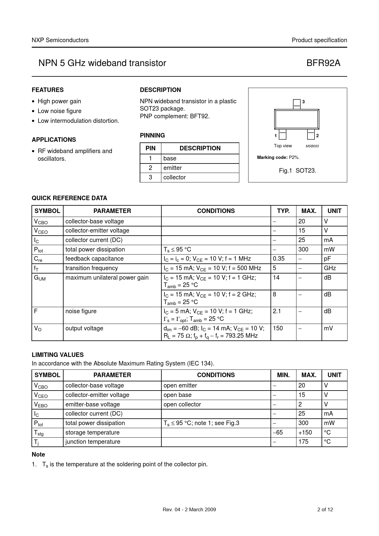 NXP Semiconductors Product specification NPN 5 GHz wideband transistor BFR92A FEATURESDESCRIPTION • High power gain NPN wideband transistor in a plastic page 3 • Low noise figure SOT23 package. • PNP complement: BFT92. Low intermodulation distortion. PINNING12APPLICATIONS Top view MSB003 • PINDESCRIPTION RF wideband amplifiers and oscillators. 1 base Marking code: P2%. 2 emitter Fig.1 SOT23. 3 collector QUICK REFERENCE DATASYMBOLPARAMETERCONDITIONSTYP.MAX.UNIT VCBO collector-base voltage − 20 V VCEO collector-emitter voltage − 15 V IC collector current (DC) − 25 mA Ptot total power dissipation Ts ≤ 95 °C − 300 mW Cre feedback capacitance IC = ic = 0; VCE = 10 V; f = 1 MHz 0.35 − pF fT transition frequency IC = 15 mA; VCE = 10 V; f = 500 MHz 5 − GHz GUM maximum unilateral power gain IC = 15 mA; VCE = 10 V; f = 1 GHz; 14 − dB Tamb = 25 °C IC = 15 mA; VCE = 10 V; f = 2 GHz; 8 − dB Tamb = 25 °C F noise figure IC = 5 mA; VCE = 10 V; f = 1 GHz; 2.1 − dB Γs = Γopt; Tamb = 25 °C VO output voltage dim = −60 dB; IC = 14 mA; VCE = 10 V; 150 − mV RL = 75 Ω; fp + fq − fr = 793.25 MHz LIMITING VALUES In accordance with the Absolute Maximum Rating System (IEC 134). SYMBOLPARAMETERCONDITIONSMIN.MAX.UNIT VCBO collector-base voltage open emitter − 20 V VCEO collector-emitter voltage open base − 15 V VEBO emitter-base voltage open collector − 2 V IC collector current (DC) − 25 mA Ptot total power dissipation Ts ≤ 95 °C; note 1; see Fig.3 − 300 mW Tstg storage temperature −65 +150 °C Tj junction temperature − 175 °C Note 1. Ts is the temperature at the soldering point of the collector pin. Rev. 04 - 2 March 2009 2 of 12 Document Outline FEATURES DESCRIPTION APPLICATIONS PINNING QUICK REFERENCE DATA LIMITING VALUES THERMAL CHARACTERISTICS CHARACTERISTICS PACKAGE OUTLINE Legal information Data sheet status Definitions Disclaimers Trademarks Contact information Revision history
