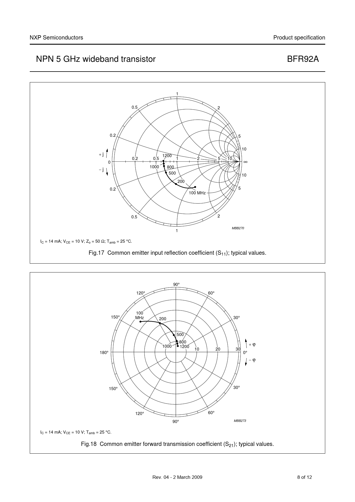 NXP Semiconductors Product specification NPN 5 GHz wideband transistor BFR92A handbook, full pagewidth 1 0.5 2 0.2 5 10 + j 1200 0.2 0.5 1 2 5 10 0 ∞ 1000 800 − j 500 10 200 0.2 5 100 MHz 0.5 2 MBB270 1 IC = 14 mA; VCE = 10 V; Zo = 50 Ω; Tamb = 25 °C. Fig.17 Common emitter input reflection coefficient (S11); typical values. handbook, full pagewidth 90° 120° 60° 100 150° MHz 30 200 ° 500 800 + ϕ 1000 1200 10 20 30 180° 0° − ϕ 150° 30° 120° 60° MBB273 90° IC = 14 mA; VCE = 10 V; Tamb = 25 °C. Fig.18 Common emitter forward transmission coefficient (S21); typical values. Rev. 04 - 2 March 2009 8 of 12 Document Outline FEATURES DESCRIPTION APPLICATIONS PINNING QUICK REFERENCE DATA LIMITING VALUES THERMAL CHARACTERISTICS CHARACTERISTICS PACKAGE OUTLINE Legal information Data sheet status Definitions Disclaimers Trademarks Contact information Revision history