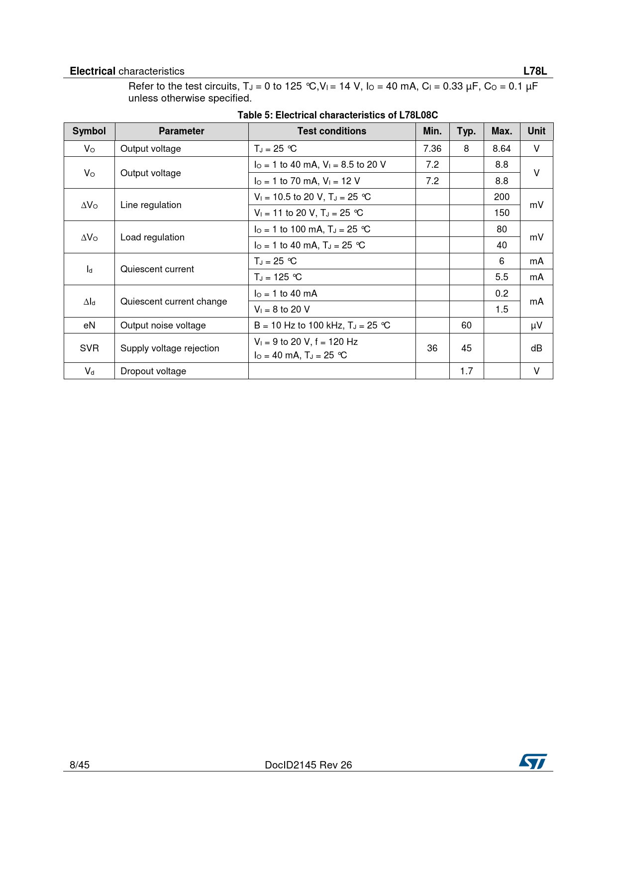 Electrical characteristics L78L Refer to the test circuits, TJ = 0 to 125 °C,VI = 14 V, IO = 40 mA, CI = 0.33 µF, CO = 0.1 µF unless otherwise specified. Table 5: Electrical characteristics of L78L08CSymbolParameterTest conditionsMin.Typ.Max.Unit VO Output voltage TJ = 25 °C 7.36 8 8.64 V IO = 1 to 40 mA, VI = 8.5 to 20 V 7.2 8.8 VO Output voltage V IO = 1 to 70 mA, VI = 12 V 7.2 8.8 VI = 10.5 to 20 V, TJ = 25 °C 200 ∆VO Line regulation mV VI = 11 to 20 V, TJ = 25 °C 150 IO = 1 to 100 mA, TJ = 25 °C 80 ∆VO Load regulation mV IO = 1 to 40 mA, TJ = 25 °C 40 TJ = 25 °C 6 mA Id Quiescent current TJ = 125 °C 5.5 mA IO = 1 to 40 mA 0.2 ∆Id Quiescent current change mA VI = 8 to 20 V 1.5 eN Output noise voltage B = 10 Hz to 100 kHz, TJ = 25 °C 60 µV VI = 9 to 20 V, f = 120 Hz SVR Supply voltage rejection 36 45 dB IO = 40 mA, TJ = 25 °C Vd Dropout voltage 1.7 V 8/45 DocID2145 Rev 26
