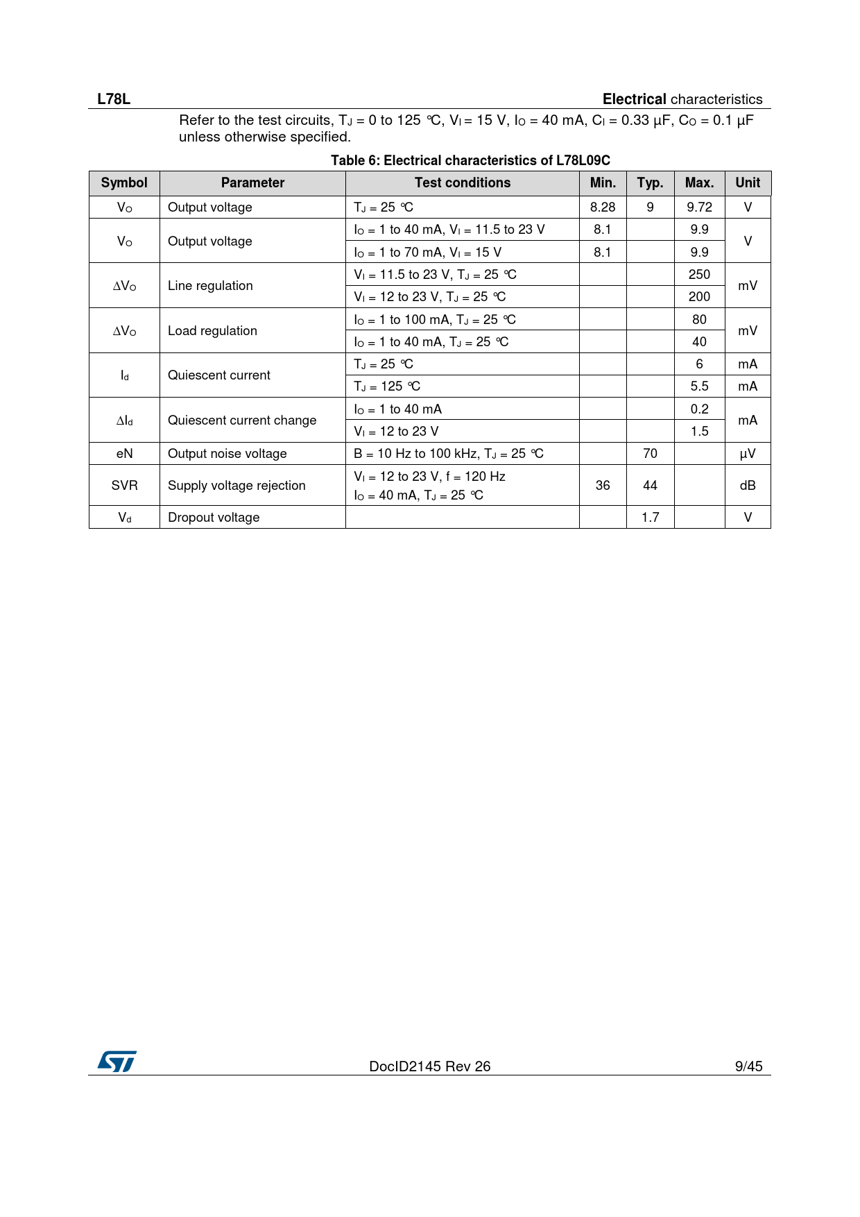Páginas / Página45 / 9 — L78L. Electrical. Table 6: Electrical characteristics of L78L09C. Symbol. …