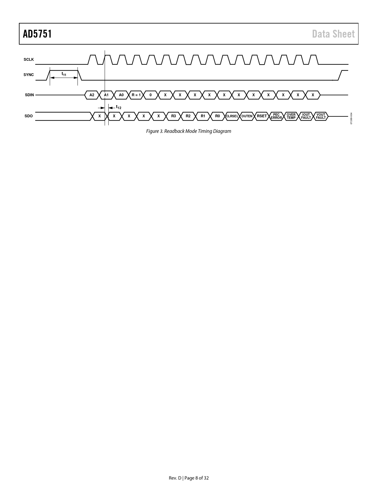 AD5751 Data Sheet SCLK t SYNC 11 SDIN A2 A1 A0 R = 1 0 X X X X X X X X X X X t12 SDO X X X X X R3 R2 R1 R0 OVER IOUT VOUT CLRSEL OUTEN RSET PEC