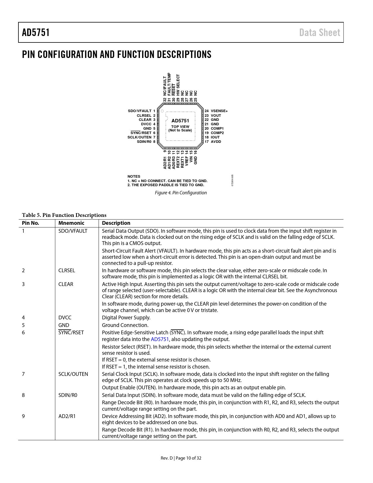 AD5751. Data Sheet. PIN CONFIGURATION AND FUNCTION DESCRIPTIONS. EMP. AU F. ESET. SDO/VFAULT 1. 24 VSENSE+. CLRSEL 2. 23 VOUT. CLEAR 3