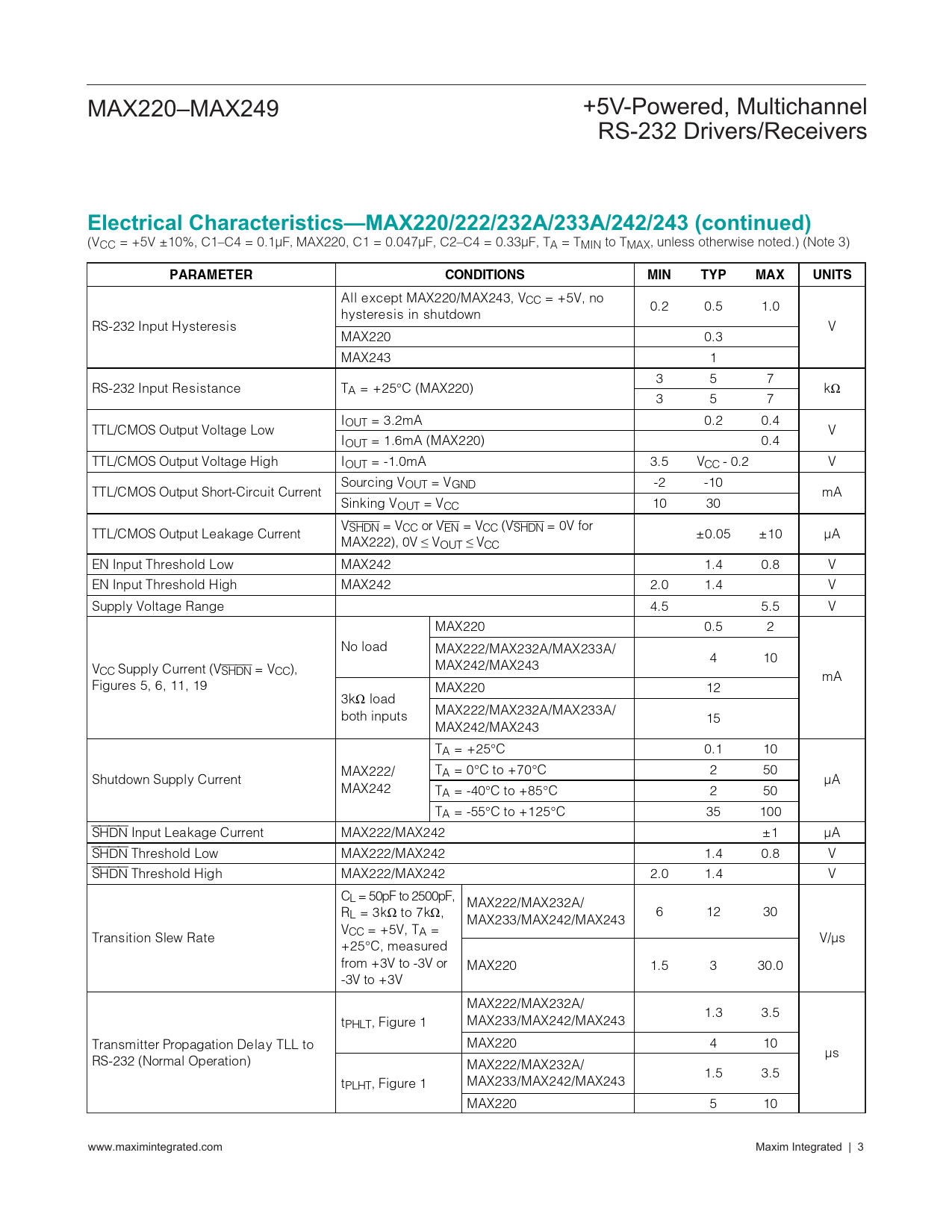 Electrical Characteristics—MAX220/222/232A/233A/242/243 (continued). PARAMETER CONDITIONS. MIN. TYP. MAX. UNITS