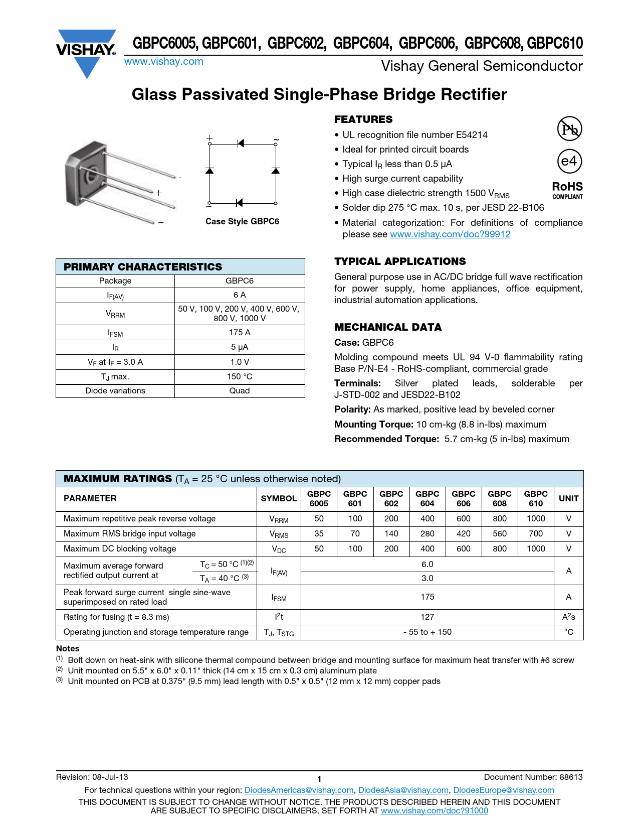 GBPC6005, GBPC601, GBPC602, GBPC604, GBPC606, GBPC608, GBPC610 www.vishay.com Vishay General Semiconductor Glass Passivated Single-Phase Bridge RectifierFEATURES • UL recognition file number E54214 ~ • Ideal for printed circuit boards • Typical I e4 R less than 0.5 μA ~ • High surge current capability • High case dielectric strength 1500 VRMS ~ • Solder dip 275 °C max. 10 s, per JESD 22-B106 ~ Case Style GBPC6 • Material categorization: For definitions of compliance please see www.vishay.com/doc?99912 TYPICAL APPLICATIONSPRIMARY CHARACTERISTICS General purpose use in AC/DC bridge full wave rectification Package GBPC6 for power supply, home appliances, office equipment, IF(AV) 6 A industrial automation applications. 50 V, 100 V, 200 V, 400 V, 600 V, VRRM 800 V, 1000 V MECHANICAL DATA IFSM 175 A Case: GBPC6 IR 5 μA Molding compound meets UL 94 V-0 flammability rating VF at IF = 3.0 A 1.0 V Base P/N-E4 - RoHS-compliant, commercial grade TJ max. 150 °C Terminals: Silver plated leads, solderable per Diode variations Quad J-STD-002 and JESD22-B102 Polarity: As marked, positive lead by beveled corner Mounting Torque: 10 cm-kg (8.8 in-lbs) maximum Recommended Torque: 5.7 cm-kg (5 in-lbs) maximum MAXIMUM RATINGS (TA = 25 °C unless otherwise noted) GBPCGBPCGBPCGBPCGBPCGBPCGBPCPARAMETERSYMBOLUNIT6005601602604606608610 Maximum repetitive peak reverse voltage VRRM 50 100 200 400 600 800 1000 V Maximum RMS bridge input voltage VRMS 35 70 140 280 420 560 700 V Maximum DC blocking voltage VDC 50 100 200 400 600 800 1000 V Maximum average forward TC = 50 °C (1)(2) 6.0 I A rectified output current at F(AV) TA = 40 °C (3) 3.0 Peak forward surge current single sine-wave I superimposed on rated load FSM 175 A Rating for fusing (t = 8.3 ms) I2t 127 A2s Operating junction and storage temperature range TJ, TSTG - 55 to + 150 °C Notes (1) Bolt down on heat-sink with silicone thermal compound between bridge and mounting surface for maximum heat transfer with #6 screw (2) Unit mounted on 5.5" x 6.0" x 0.11" thick (14 cm x 15 cm x 0.3 cm) aluminum plate (3) Unit mounted on PCB at 0.375" (9.5 mm) lead length with 0.5" x 0.5" (12 mm x 12 mm) copper pads Revision: 08-Jul-13 1 Document Number: 88613 For technical questions within your region: DiodesAmericas@vishay.com, DiodesAsia@vishay.com, DiodesEurope@vishay.com THIS DOCUMENT IS SUBJECT TO CHANGE WITHOUT NOTICE. THE PRODUCTS DESCRIBED HEREIN AND THIS DOCUMENT ARE SUBJECT TO SPECIFIC DISCLAIMERS, SET FORTH AT www.vishay.com/doc?91000