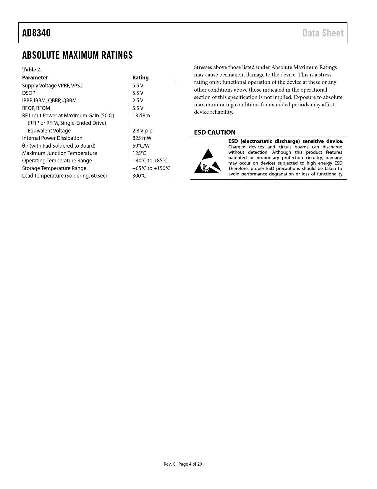 AD8340. Data Sheet. ABSOLUTE MAXIMUM RATINGS Table 2. Parameter. Rating. ESD CAUTION
