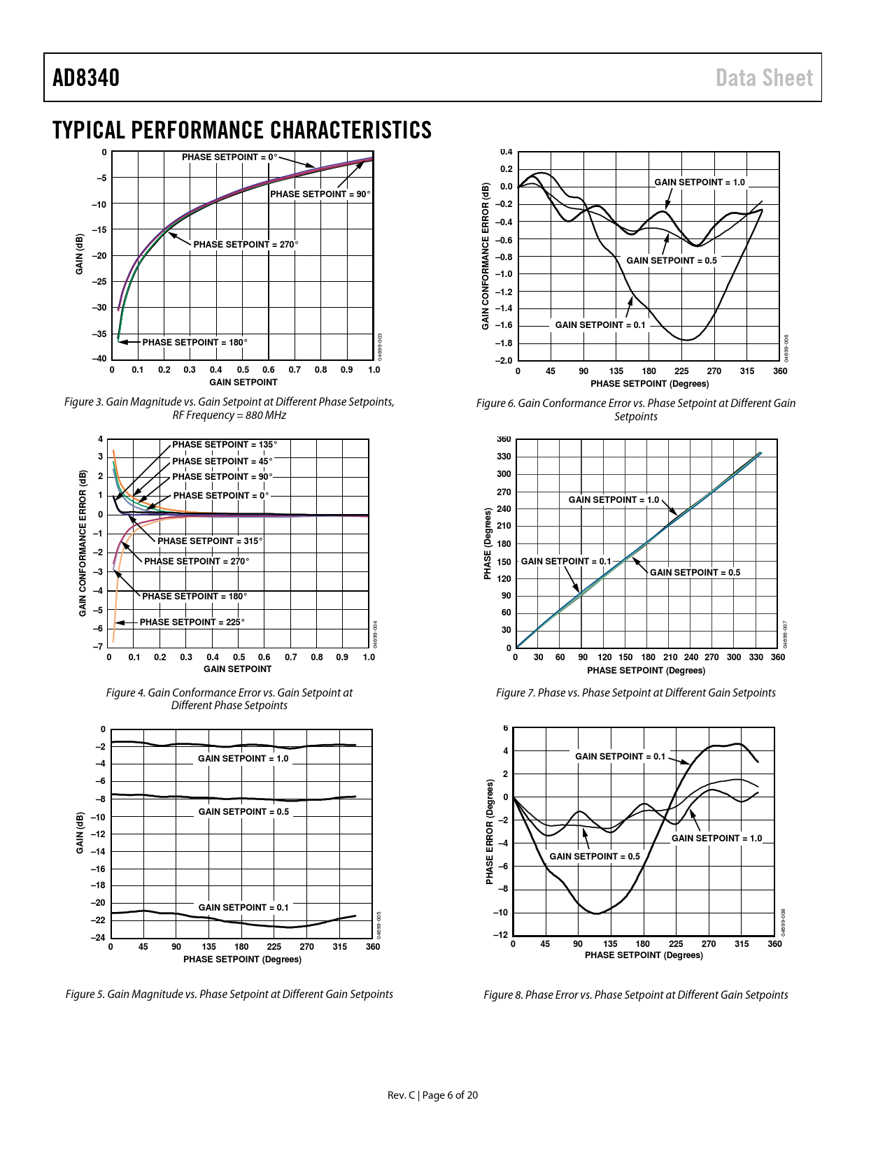 Figure 3. Gain Magnitude vs. Gain Setpoint at Different Phase Setpoints, Figure 6. Gain Conformance Error vs. Phase Setpoint at Different Gain RF Frequency = 880 MHz Setpoints