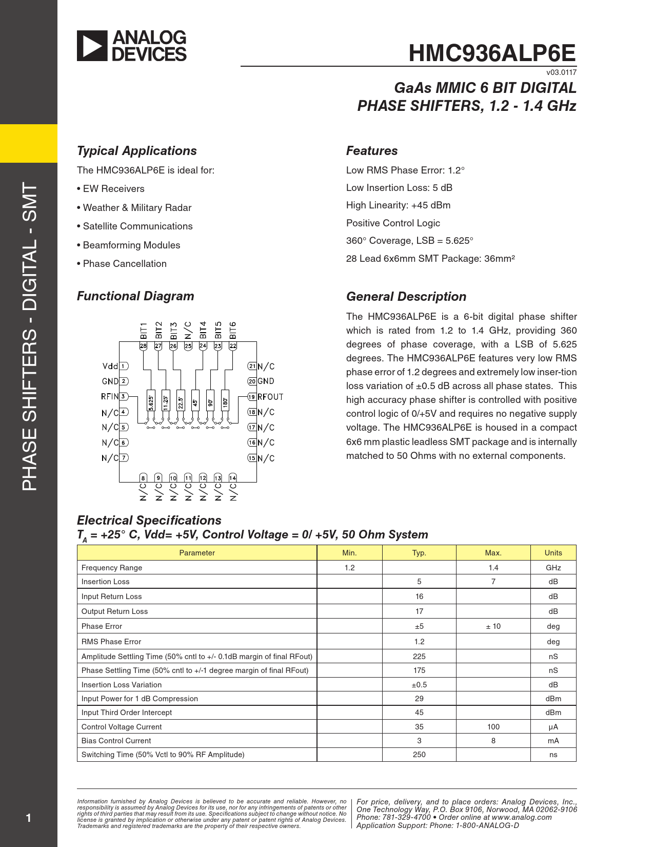 The HMC936ALP6E is a 6-bit digital phase shifter S - D which is rated from 1.2 to 1.4 GHz, providing 360 R degrees of phase coverage, with a LSB of 5.625 E degrees. The HMC936ALP6E features very low RMS T phase error of 1.2 degrees and extremely low inser-tion IF loss variation of ±0.5 dB across all phase states. This H high accuracy phase shifter is control ed with positive control logic of 0/+5V and requires no negative supply E S voltage. The HMC936ALP6E is housed in a compact S 6x6 mm plastic leadless SMT package and is internal y A matched to 50 Ohms with no external components. H P