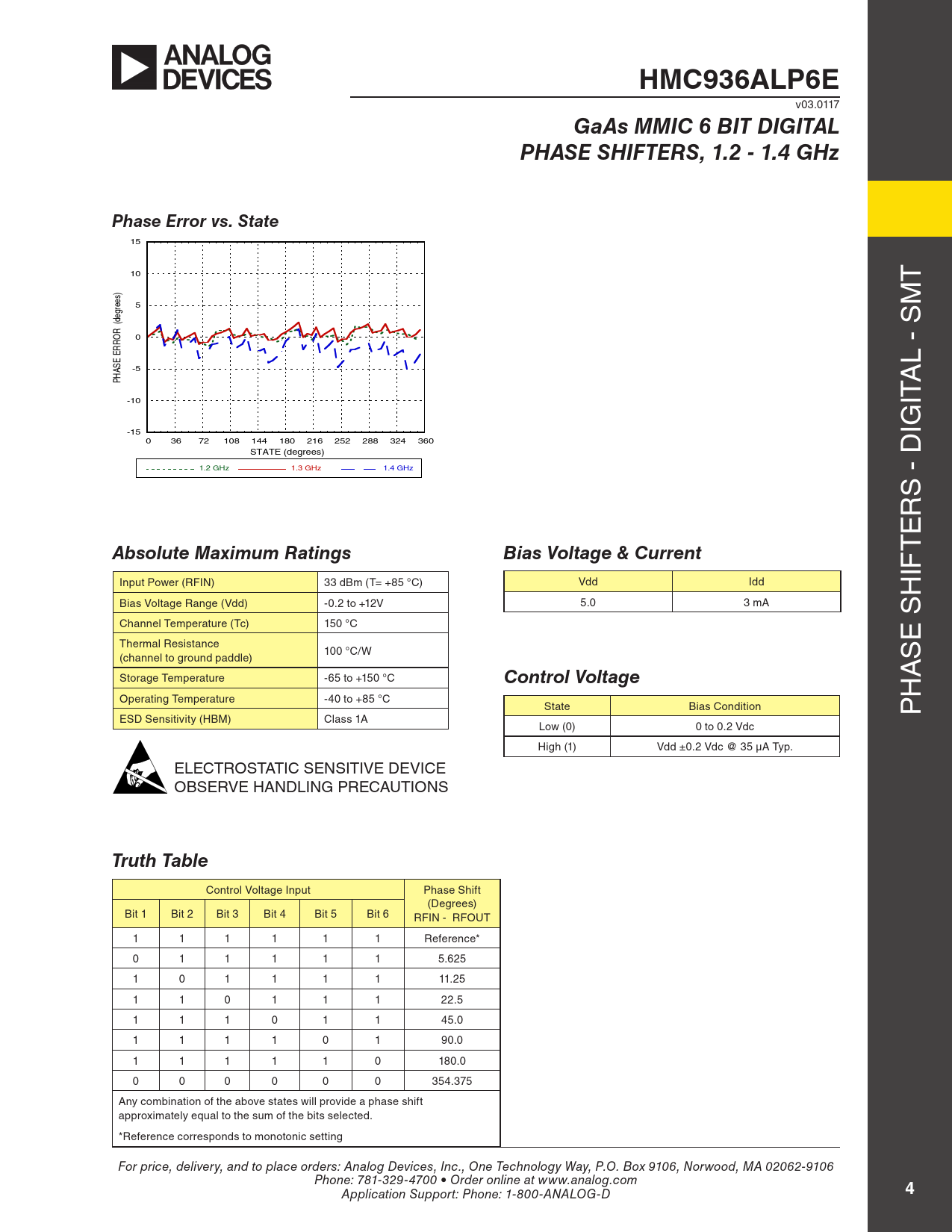 HMC936ALP6E. GaAs MMIC 6 BIT DIGITAL. PHASE SHIFTERS, 1.2 - 1.4 GHz. Phase Error vs. State. Absolute Maximum Ratings