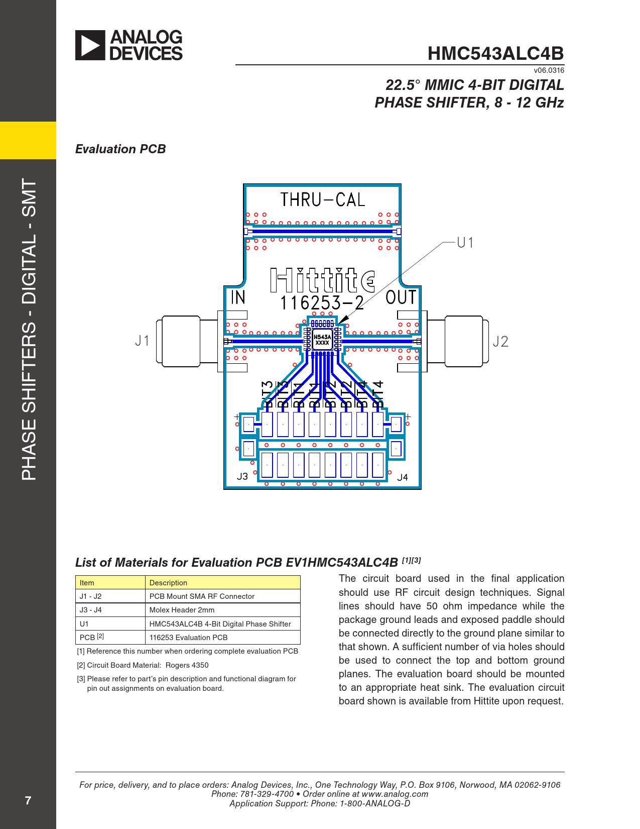 HMC543ALC4B v06.0316 22.5° MMIC 4-BIT DIGITALPHASE SHIFTER, 8 - 12 GHzEvaluation PCB T M L - S ITA IG S - D R E T IF H E S S A H P List of Materials for Evaluation PCB EV1HMC543ALC4B [1][3] The circuit board used in the final application Item Description should use RF circuit design techniques. Signal J1 - J2 PCB Mount SMA RF Connector lines should have 50 ohm impedance while the J3 - J4 Molex Header 2mm package ground leads and exposed paddle should U1 HMC543ALC4B 4-Bit Digital Phase Shifter be connected directly to the ground plane similar to PCB [2] 116253 Evaluation PCB that shown. A sufficient number of via holes should [1] Reference this number when ordering complete evaluation PCB be used to connect the top and bottom ground [2] Circuit Board Material: Rogers 4350 planes. The evaluation board should be mounted [3] Please refer to part’s pin description and functional diagram for pin out assignments on evaluation board. to an appropriate heat sink. The evaluation circuit board shown is available from Hittite upon request. For price, delivery, and to place orders: Analog Devices, Inc., One Technology Way, P.O. Box 9106, Norwood, MA 02062-9106 Phone: 781-329-4700 • Order online at www.analog.com 7 Application Support: Phone: 1-800-ANALOG-D