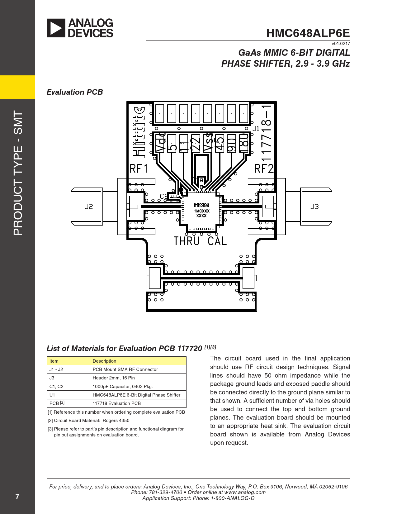 HMC648ALP6E v01.0217 GaAs MMIC 6-BIT DIGITALPHASE SHIFTER, 2.9 - 3.9 GHzEvaluation PCB t M e - S P y t t c u d o r P List of Materials for Evaluation PCB 117720 [1][3] the circuit board used in the final application Item description should use rF circuit design techniques. Signal J1 - J2 PcB Mount SMA rF connector lines should have 50 ohm impedance while the J3 Header 2mm, 16 Pin package ground leads and exposed paddle should c1, c2 1000pF capacitor, 0402 Pkg. be connected directly to the ground plane similar to u1 HMc648ALP6e 6-Bit digital Phase Shifter that shown. A sufficient number of via holes should PcB [2] 117718 evaluation PcB be used to connect the top and bottom ground [1] reference this number when ordering complete evaluation PcB planes. the evaluation board should be mounted [2] circuit Board Material: rogers 4350 to an appropriate heat sink. the evaluation circuit [3] Please refer to part’s pin description and functional diagram for pin out assignments on evaluation board. board shown is available from Analog devices upon request. For price, delivery, and to place orders: Analog Devices, Inc., One Technology Way, P.O. Box 9106, Norwood, MA 02062-9106 Phone: 781-329-4700 • Order online at www.analog.com 7 Application Support: Phone: 1-800-ANALOG-D