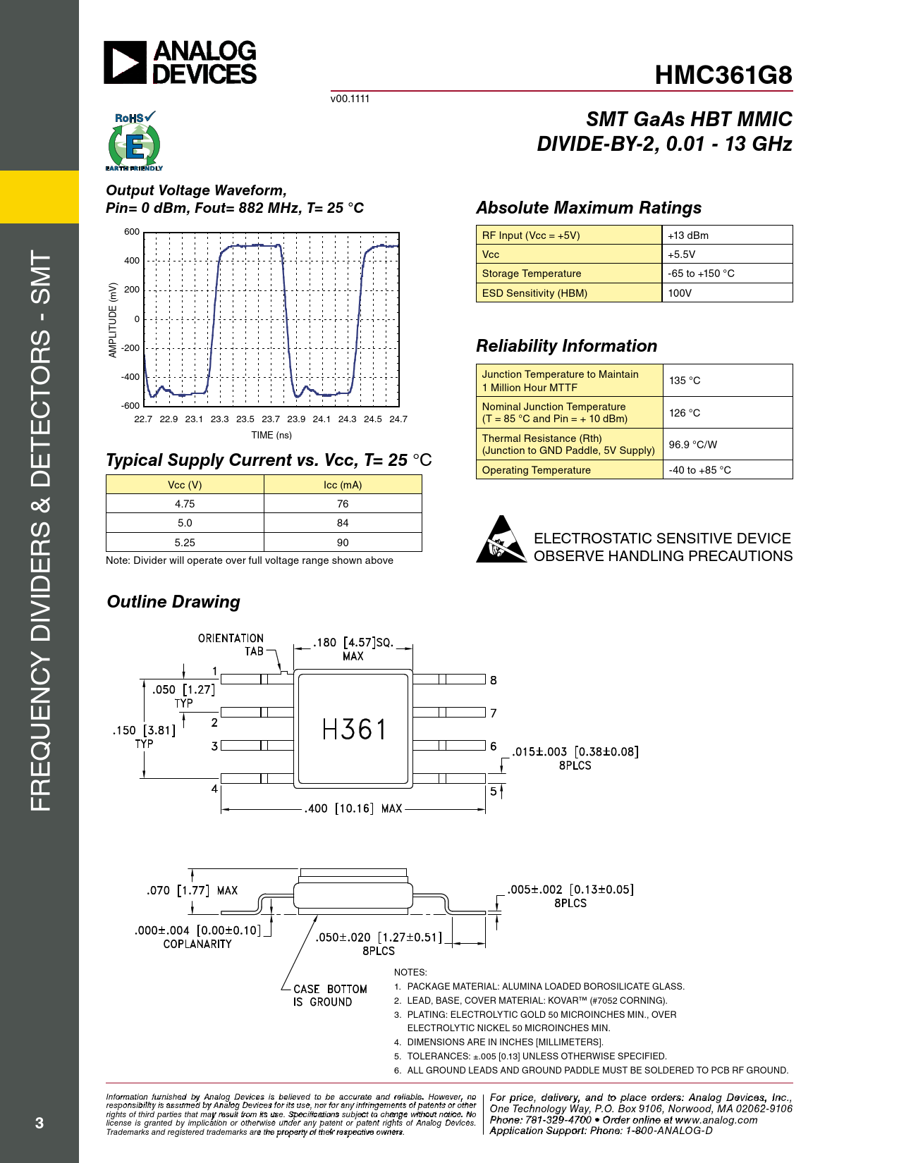 Páginas / Página6 / 3 — HMC361G8. SMT GaAs HBT MMIC. DIVIDE-BY-2, 0.01 - 13 GHz. Output Voltage …