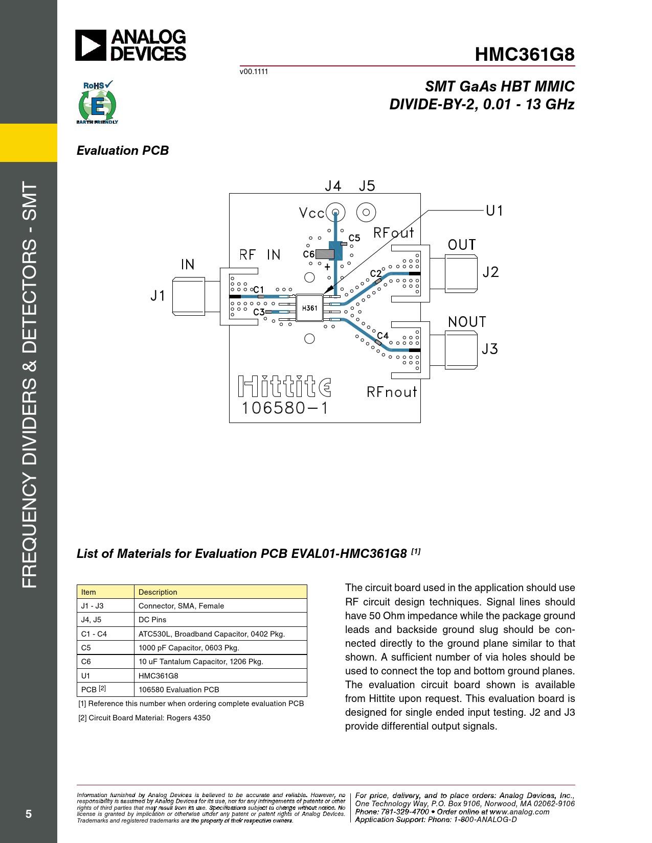 HMC361G8. SMT GaAs HBT MMIC. DIVIDE-BY-2, 0.01 - 13 GHz. Evaluation PCB