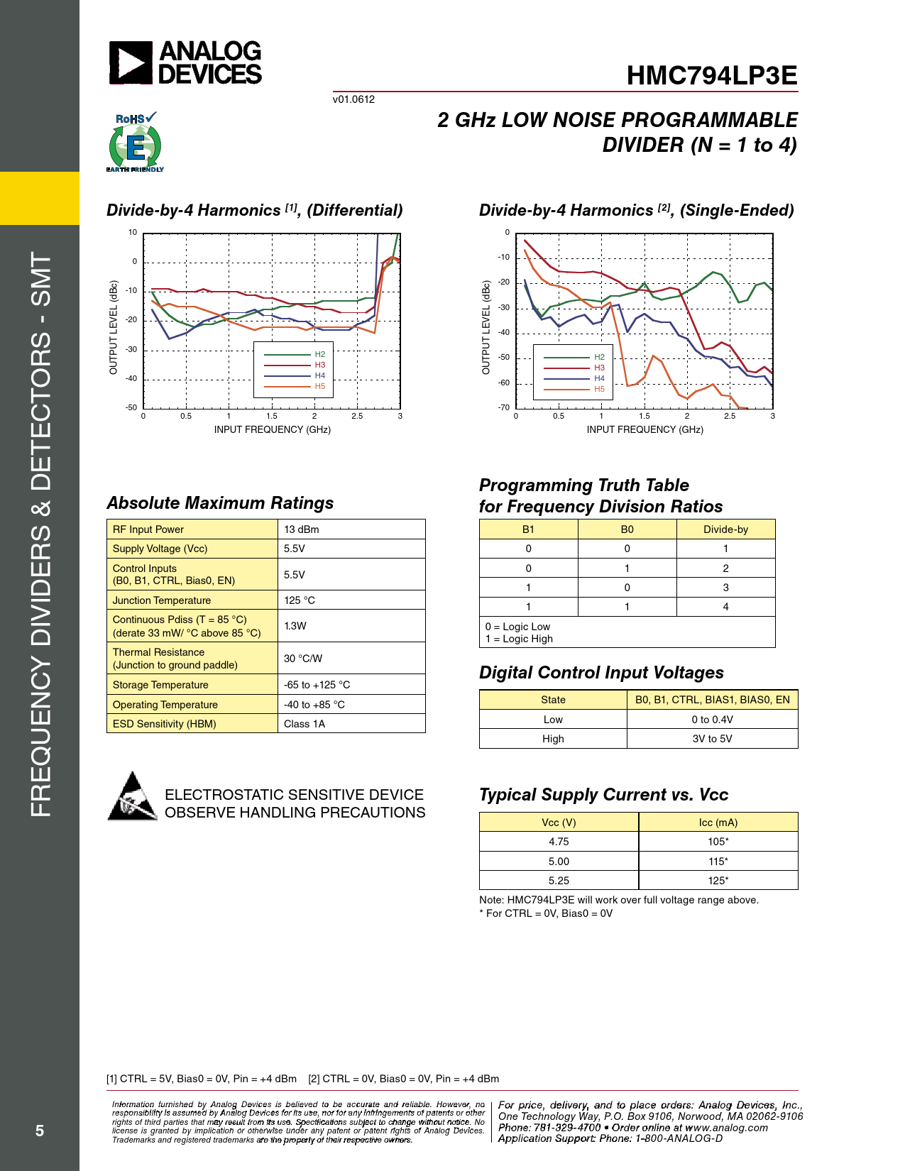 HMC794LP3E. 2 GHz LOW NOISE PROGRAMMABLE. DIVIDER (N = 1 to 4). Divide-by-4 Harmonics [1], (Differential)