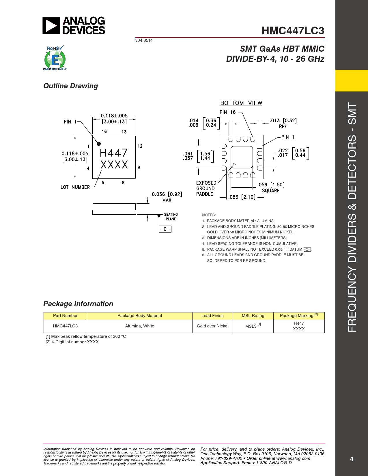 HMC447LC3. SMT GaAs HBT MMIC. DIVIDE-BY-4, 10 - 26 GHz. Outline Drawing. Package Information