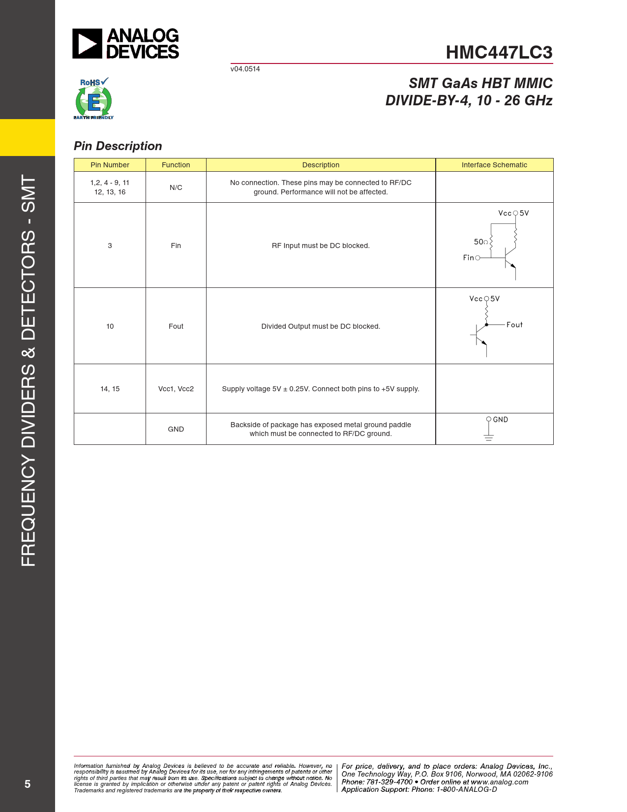 HMC447LC3. SMT GaAs HBT MMIC. DIVIDE-BY-4, 10 - 26 GHz. Pin Description