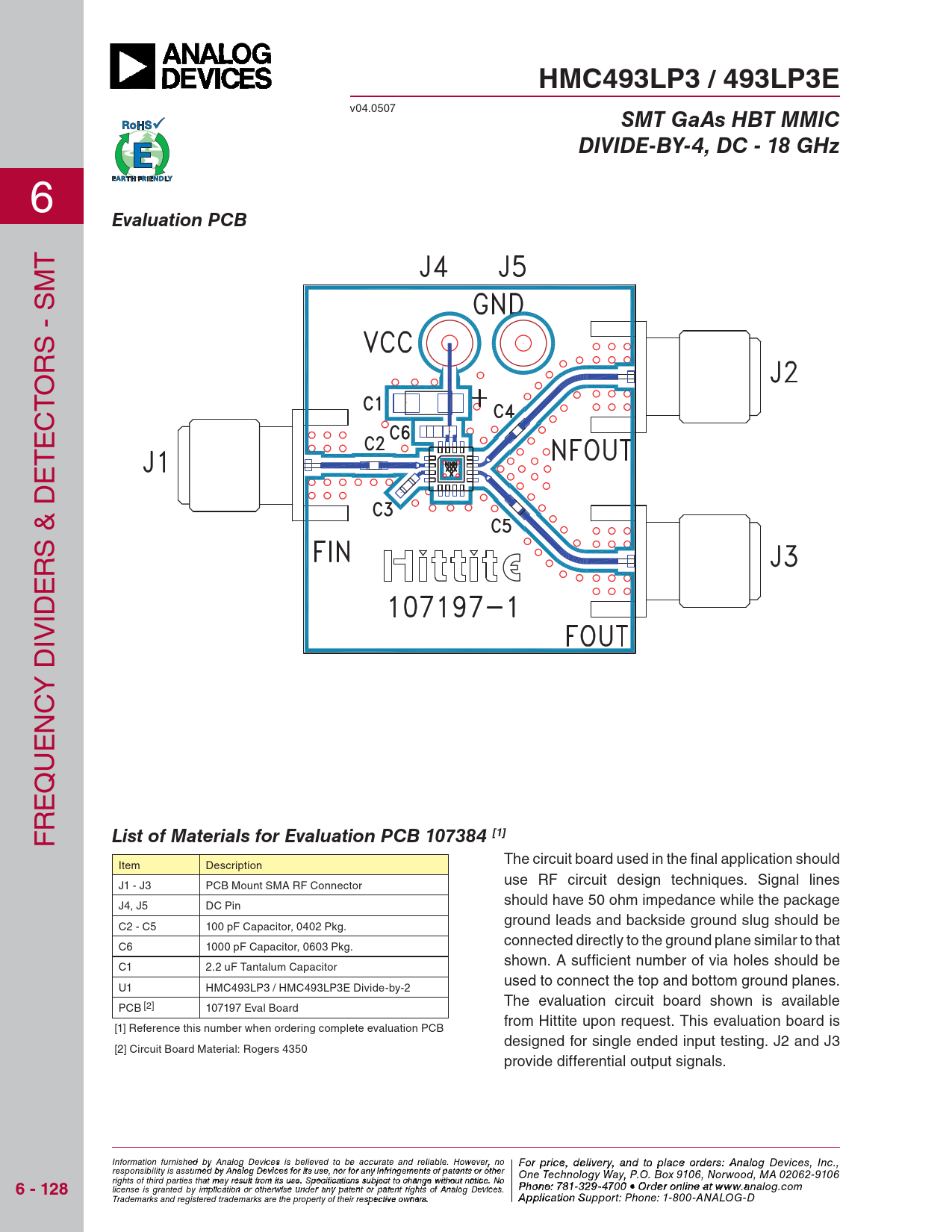 HMC493LP3 / 493LP3E. SMT GaAs HBT MMIC. DIVIDE-BY-4, DC - 18 GHz. Evaluation PCB