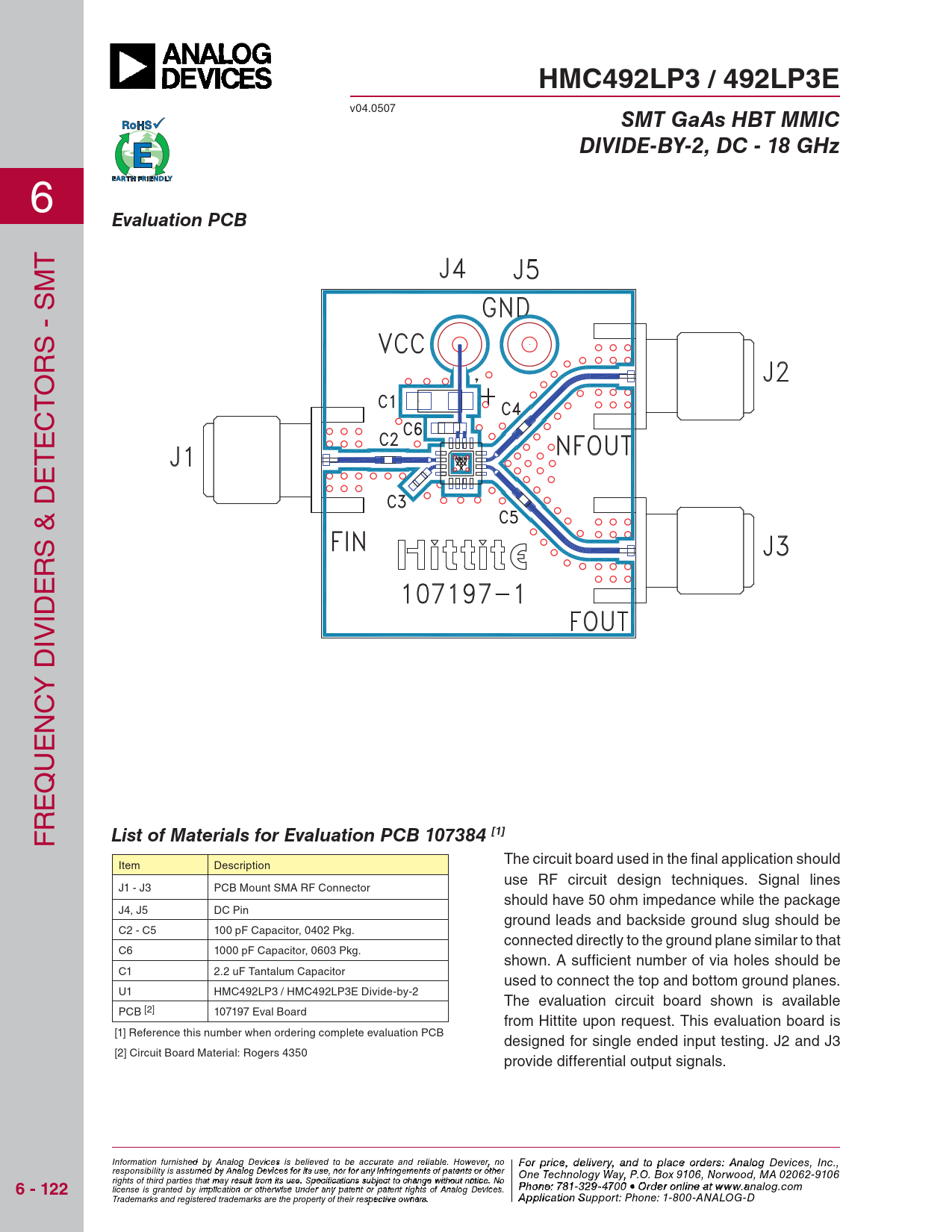 HMC492LP3 / 492LP3E. SMT GaAs HBT MMIC. DIVIDE-BY-2, DC - 18 GHz. Evaluation PCB