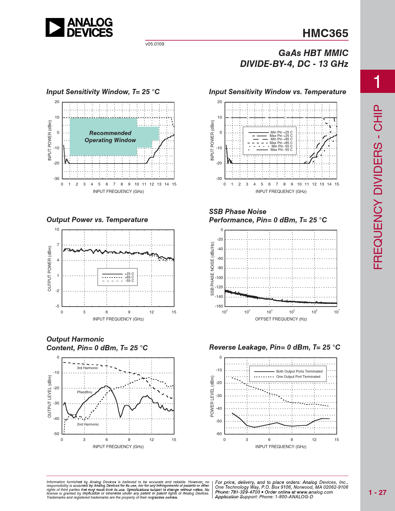 HMC365. GaAs HBT MMIC. DIVIDE-BY-4, DC - 13 GHz. Input Sensitivity Window, T= 25 °C. Input Sensitivity Window vs. Temperature