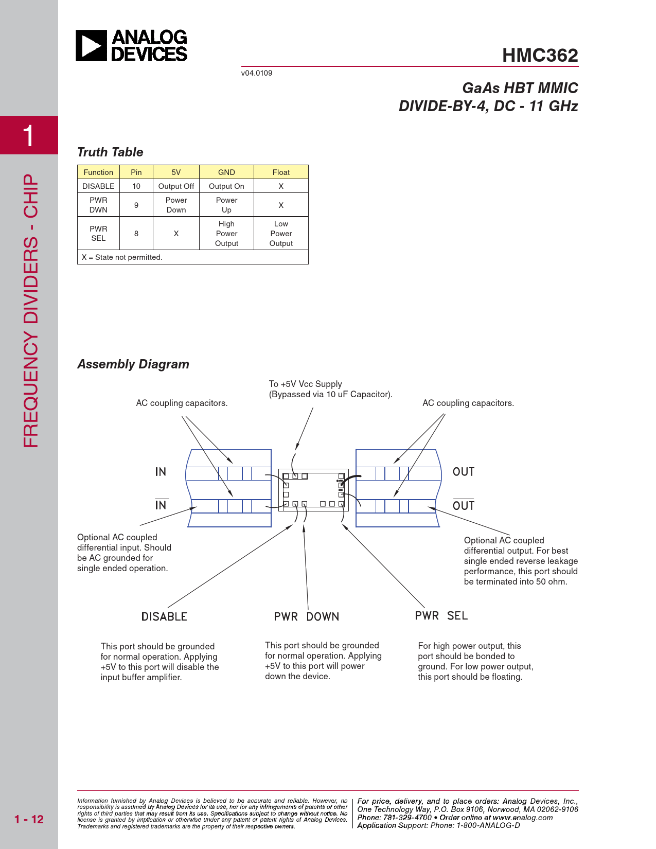 HMC362 v04.0109 GaAs HBT MMICDIVIDE-BY-4, DC - 11 GHz 1 Truth Table Function Pin 5V GND Float IP DISABLE 10 Output Off Output On X H PWR Power Power 9 X DWN Down Up High Low PWR 8 X Power Power S - C SEL Output Output R X = State not permitted. E ID IV Y D NC Assembly Diagram E U To +5V Vcc Supply (Bypassed via 10 uF Capacitor). Q AC coupling capacitors. AC coupling capacitors. E R F Optional AC coupled Optional AC coupled differential input. Should differential output. For best be AC grounded for single ended reverse leakage single ended operation. performance, this port should be terminated into 50 ohm. This port should be grounded This port should be grounded For high power output, this for normal operation. Applying for normal operation. Applying port should be bonded to +5V to this port will disable the +5V to this port will power ground. For low power output, input buffer amplifi er. down the device. this port should be fl oating. Information furnish F ed obr pri y Anal ce, de og Device li s vie s r beyli, a eve nd to pla d to be accura ce o te and rder reliabl s e , pl . Ho ease co wever, no For price, delivery, and to place orders: Analog Devices, Inc., responsibility is assumed by Analog Devices for its use, nor for any infringements of patents or other ntact Hittite Microwave Corporation: One Technology Way, P.O. Box 9106, Norwood, MA 02062-9106 rights of third parties that may result from its use. Specifications subject to change without notice. No 1 - 12 20 Alpha Road, Chelmsford, MA 01824 Phone: 978 Phon - e 25 : 7 0 81--3 32 3 9 4 - 3 F 70 ax 0 • O : 978 rder on -li25 n 0 e a - t 33 ww 73 license is granted by implication or otherwise under any patent or patent rights of Analog Devices. w.analog.com Order On Trademarks and registered trademarks are the property of their respective owners. -line at www.h A it p tpite.co licatio m n Support: Phone: 1-800-ANALOG-D