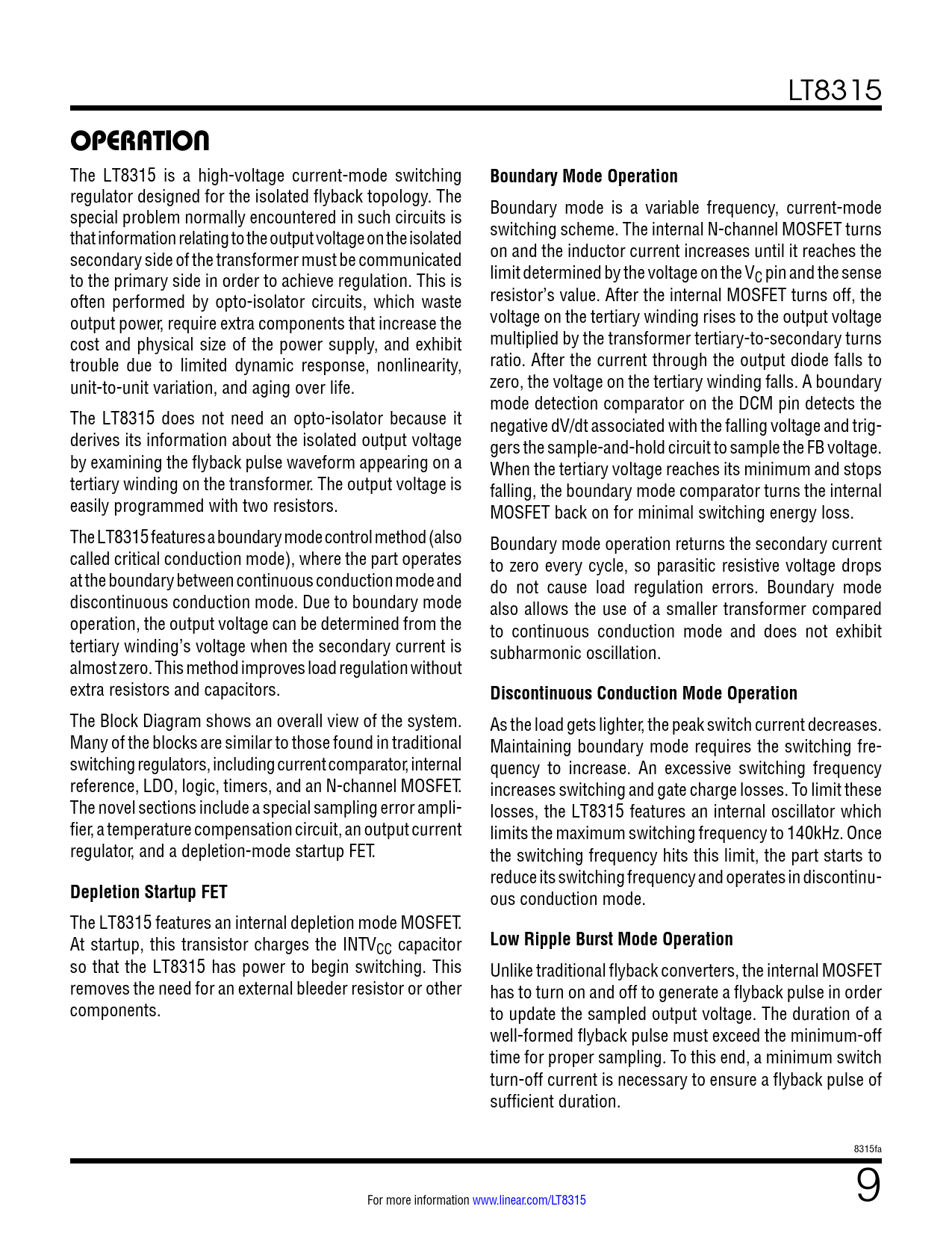LT8315 OPERATION The LT8315 is a high-voltage current-mode switching Boundary Mode Operation regulator designed for the isolated flyback topology. The Boundary mode is a variable frequency, current-mode special problem normally encountered in such circuits is switching scheme. The internal N-channel MOSFET turns that information relating to the output voltage on the isolated on and the inductor current increases until it reaches the secondary side of the transformer must be communicated limit determined by the voltage on the VC pin and the sense to the primary side in order to achieve regulation. This is resistor’s value. After the internal MOSFET turns off, the often performed by opto-isolator circuits, which waste voltage on the tertiary winding rises to the output voltage output power, require extra components that increase the multiplied by the transformer tertiary-to-secondary turns cost and physical size of the power supply, and exhibit ratio. After the current through the output diode falls to trouble due to limited dynamic response, nonlinearity, zero, the voltage on the tertiary winding falls. A boundary unit-to-unit variation, and aging over life. mode detection comparator on the DCM pin detects the The LT8315 does not need an opto-isolator because it negative dV/dt associated with the falling voltage and trig- derives its information about the isolated output voltage gers the sample-and-hold circuit to sample the FB voltage. by examining the flyback pulse waveform appearing on a When the tertiary voltage reaches its minimum and stops tertiary winding on the transformer. The output voltage is falling, the boundary mode comparator turns the internal easily programmed with two resistors. MOSFET back on for minimal switching energy loss. The LT8315 features a boundary mode control method (also Boundary mode operation returns the secondary current called critical conduction mode), where the part operates to zero every cycle, so parasitic resistive voltage drops at the boundary between continuous conduction mode and do not cause load regulation errors. Boundary mode discontinuous conduction mode. Due to boundary mode also allows the use of a smaller transformer compared operation, the output voltage can be determined from the to continuous conduction mode and does not exhibit tertiary winding’s voltage when the secondary current is subharmonic oscillation. almost zero. This method improves load regulation without extra resistors and capacitors. Discontinuous Conduction Mode Operation The Block Diagram shows an overall view of the system. As the load gets lighter, the peak switch current decreases. Many of the blocks are similar to those found in traditional Maintaining boundary mode requires the switching fre- switching regulators, including current comparator, internal quency to increase. An excessive switching frequency reference, LDO, logic, timers, and an N-channel MOSFET. increases switching and gate charge losses. To limit these The novel sections include a special sampling error ampli- losses, the LT8315 features an internal oscillator which fier, a temperature compensation circuit, an output current limits the maximum switching frequency to 140kHz. Once regulator, and a depletion-mode startup FET. the switching frequency hits this limit, the part starts to reduce its switching frequency and operates in discontinu- Depletion Startup FET ous conduction mode. The LT8315 features an internal depletion mode MOSFET. Low Ripple Burst Mode Operation At startup, this transistor charges the INTVCC capacitor so that the LT8315 has power to begin switching. This Unlike traditional flyback converters, the internal MOSFET removes the need for an external bleeder resistor or other has to turn on and off to generate a flyback pulse in order components. to update the sampled output voltage. The duration of a well-formed flyback pulse must exceed the minimum-off time for proper sampling. To this end, a minimum switch turn-off current is necessary to ensure a flyback pulse of sufficient duration. 8315fa For more information www.linear.com/LT8315 9 Document Outline FEATURES APPLICATIONS DESCRIPTION TYPICAL APPLICATION ABSOLUTE MAXIMUM RATINGS PIN CONFIGURATION ORDER INFORMATION ELECTRICAL CHARACTERISTICS TYPICAL PERFORMANCE CHARACTERISTICS PIN FUNCTIONS BLOCK DIAGRAM OPERATION APPLICATIONS INFORMATION PACKAGE DESCRIPTION REVISION HISTORY TYPICAL APPLICATION RELATED PARTS