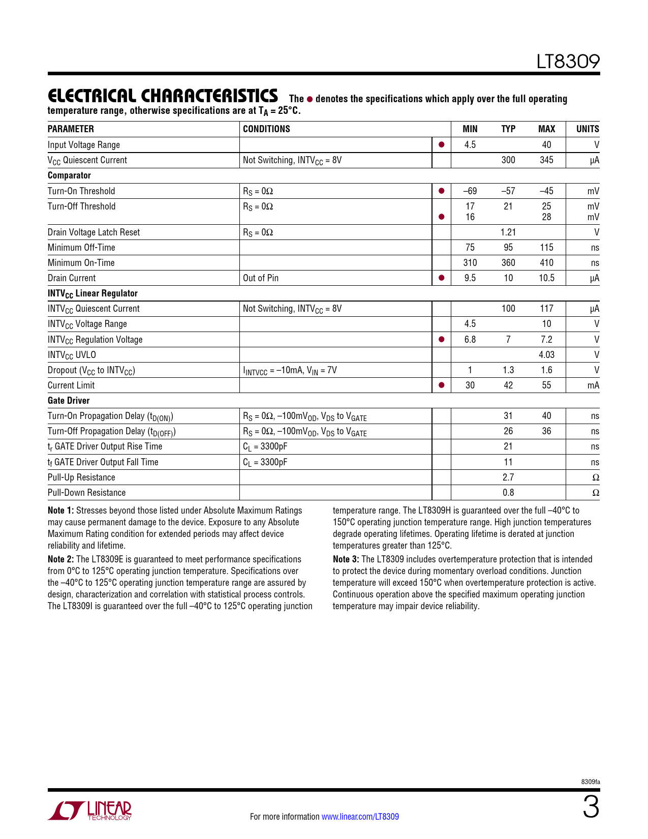 LT8309 e lecTrical characTerisTics The l denotes the specifications which apply over the full operatingtemperature range, otherwise specifications are at TA = 25°C. PARAMETERCONDITIONSMINTYPMAXUNITS Input Voltage Range l 4.5 40 V VCC Quiescent Current Not Switching, INTVCC = 8V 300 345 µA Comparator Turn-On Threshold RS = 0Ω l –69 –57 –45 mV Turn-Off Threshold RS = 0Ω 17 21 25 mV l 16 28 mV Drain Voltage Latch Reset RS = 0Ω 1.21 V Minimum Off-Time 75 95 115 ns Minimum On-Time 310 360 410 ns Drain Current Out of Pin l 9.5 10 10.5 µA INTVCC Linear Regulator INTVCC Quiescent Current Not Switching, INTVCC = 8V 100 117 µA INTVCC Voltage Range 4.5 10 V INTVCC Regulation Voltage l 6.8 7 7.2 V INTVCC UVLO 4.03 V Dropout (VCC to INTVCC) IINTVCC = –10mA, VIN = 7V 1 1.3 1.6 V Current Limit l 30 42 55 mA Gate Driver Turn-On Propagation Delay (tD(ON)) RS = 0Ω, –100mVOD, VDS to VGATE 31 40 ns Turn-Off Propagation Delay (tD(OFF)) RS = 0Ω, –100mVOD, VDS to VGATE 26 36 ns tr GATE Driver Output Rise Time CL = 3300pF 21 ns tf GATE Driver Output Fall Time CL = 3300pF 11 ns Pull-Up Resistance 2.7 Ω Pull-Down Resistance 0.8 Ω Note 1: Stresses beyond those listed under Absolute Maximum Ratings temperature range. The LT8309H is guaranteed over the full –40°C to may cause permanent damage to the device. Exposure to any Absolute 150°C operating junction temperature range. High junction temperatures Maximum Rating condition for extended periods may affect device degrade operating lifetimes. Operating lifetime is derated at junction reliability and lifetime. temperatures greater than 125°C. Note 2: The LT8309E is guaranteed to meet performance specifications Note 3: The LT8309 includes overtemperature protection that is intended from 0°C to 125°C operating junction temperature. Specifications over to protect the device during momentary overload conditions. Junction the –40°C to 125°C operating junction temperature range are assured by temperature will exceed 150°C when overtemperature protection is active. design, characterization and correlation with statistical process controls. Continuous operation above the specified maximum operating junction The LT8309I is guaranteed over the full –40°C to 125°C operating junction temperature may impair device reliability. 8309fa For more information www.linear.com/LT8309 3