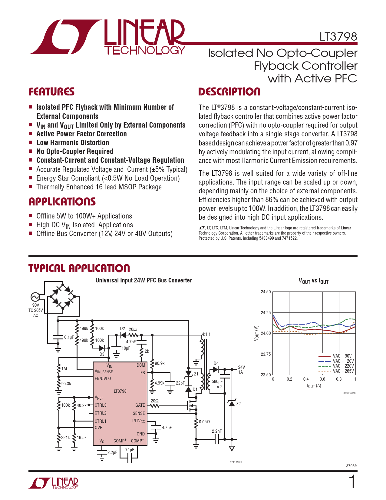 ance with most Harmonic Current Emission requirements. n Accurate Regulated Voltage and Current (±5% Typical) The LT3798 is well suited for a wide variety of off-line n Energy Star Compliant (<0.5W No Load Operation) applications. The input range can be scaled up or down, n Thermally Enhanced 16-lead MSOP Package depending mainly on the choice of external components. Efficiencies higher than 86% can be achieved with output