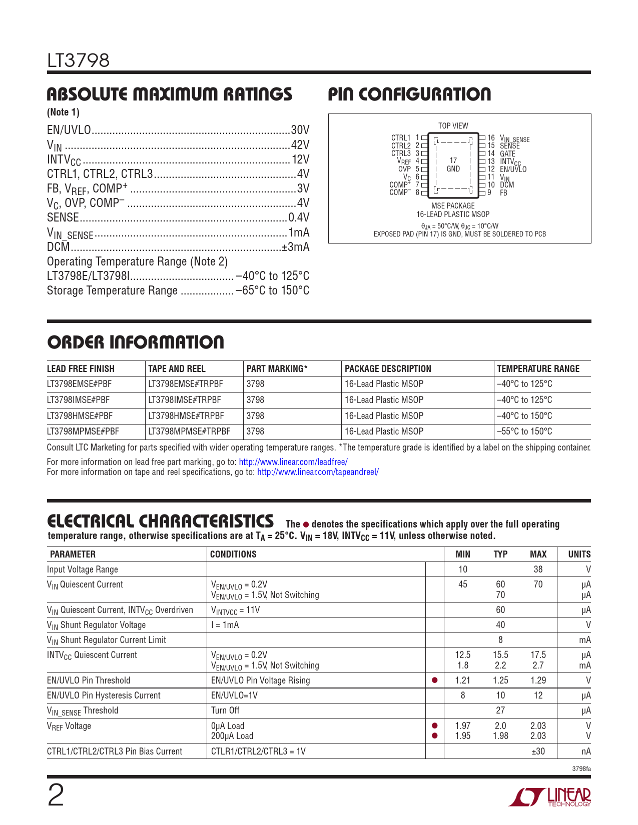 LT3798 ABSOLUTE MAXIMUM RATINGSPIN CONFIGURATION(Note 1) EN/UVLO ...30V TOP VIEW V CTRL1 1 16 VIN_SENSE IN ..42V CTRL2 2 15 SENSE INTV CTRL3 3 14 GATE CC ..12V VREF 4 17 13 INTVCC CTRL1, CTRL2, CTRL3 ..4V OVP 5 GND 12 EN/UVLO V 6 C 11 VIN FB, V COMP+ 7 10 DCM REF, COMP+ ..3V COMP– 8 9 FB VC, OVP, COMP– ...4V MSE PACKAGE SENSE ..0.4V 16-LEAD PLASTIC MSOP V θJA = 50°C/W, θJC = 10°C/W IN_SENSE ...1mA EXPOSED PAD (PIN 17) IS GND, MUST BE SOLDERED TO PCB DCM ...±3mA Operating Temperature Range (Note 2) LT3798E/LT3798I... –40°C to 125°C Storage Temperature Range .. –65°C to 150°C ORDER INFORMATION LEAD FREE FINISHTAPE AND REELPART MARKING*PACKAGE DESCRIPTIONTEMPERATURE RANGE LT3798EMSE#PBF LT3798EMSE#TRPBF 3798 16-Lead Plastic MSOP –40°C to 125°C LT3798IMSE#PBF LT3798IMSE#TRPBF 3798 16-Lead Plastic MSOP –40°C to 125°C LT3798HMSE#PBF LT3798HMSE#TRPBF 3798 16-Lead Plastic MSOP –40°C to 150°C LT3798MPMSE#PBF LT3798MPMSE#TRPBF 3798 16-Lead Plastic MSOP –55°C to 150°C Consult LTC Marketing for parts specified with wider operating temperature ranges. *The temperature grade is identified by a label on the shipping container. For more information on lead free part marking, go to: http://www.linear.com/leadfree/ For more information on tape and reel specifications, go to: http://www.linear.com/tapeandreel/ ELECTRICAL CHARACTERISTICSThe l denotes the specifications which apply over the full operatingtemperature range, otherwise specifications are at TA = 25°C. VIN = 18V, INTVCC = 11V, unless otherwise noted.PARAMETERCONDITIONSMINTYPMAXUNITS Input Voltage Range 10 38 V VIN Quiescent Current VEN/UVLO = 0.2V 45 60 70 µA VEN/UVLO = 1.5V, Not Switching 70 µA VIN Quiescent Current, INTVCC Overdriven VINTVCC = 11V 60 µA VIN Shunt Regulator Voltage I = 1mA 40 V VIN Shunt Regulator Current Limit 8 mA INTVCC Quiescent Current VEN/UVLO = 0.2V 12.5 15.5 17.5 µA VEN/UVLO = 1.5V, Not Switching 1.8 2.2 2.7 mA EN/UVLO Pin Threshold EN/UVLO Pin Voltage Rising l 1.21 1.25 1.29 V EN/UVLO Pin Hysteresis Current EN/UVLO=1V 8 10 12 µA VIN_SENSE Threshold Turn Off 27 µA VREF Voltage 0µA Load l 1.97 2.0 2.03 V 200µA Load l 1.95 1.98 2.03 V CTRL1/CTRL2/CTRL3 Pin Bias Current CTLR1/CTRL2/CTRL3 = 1V ±30 nA 3798fa 2 Document Outline Description Features Applications Typical Application Absolute Maximum Ratings Pin Configuration Order Information Electrical Characteristics Typical Performance Characteristics Pin Functions Block Diagram Operation Typical Applications Package Description Revision History Typical Application Related Parts