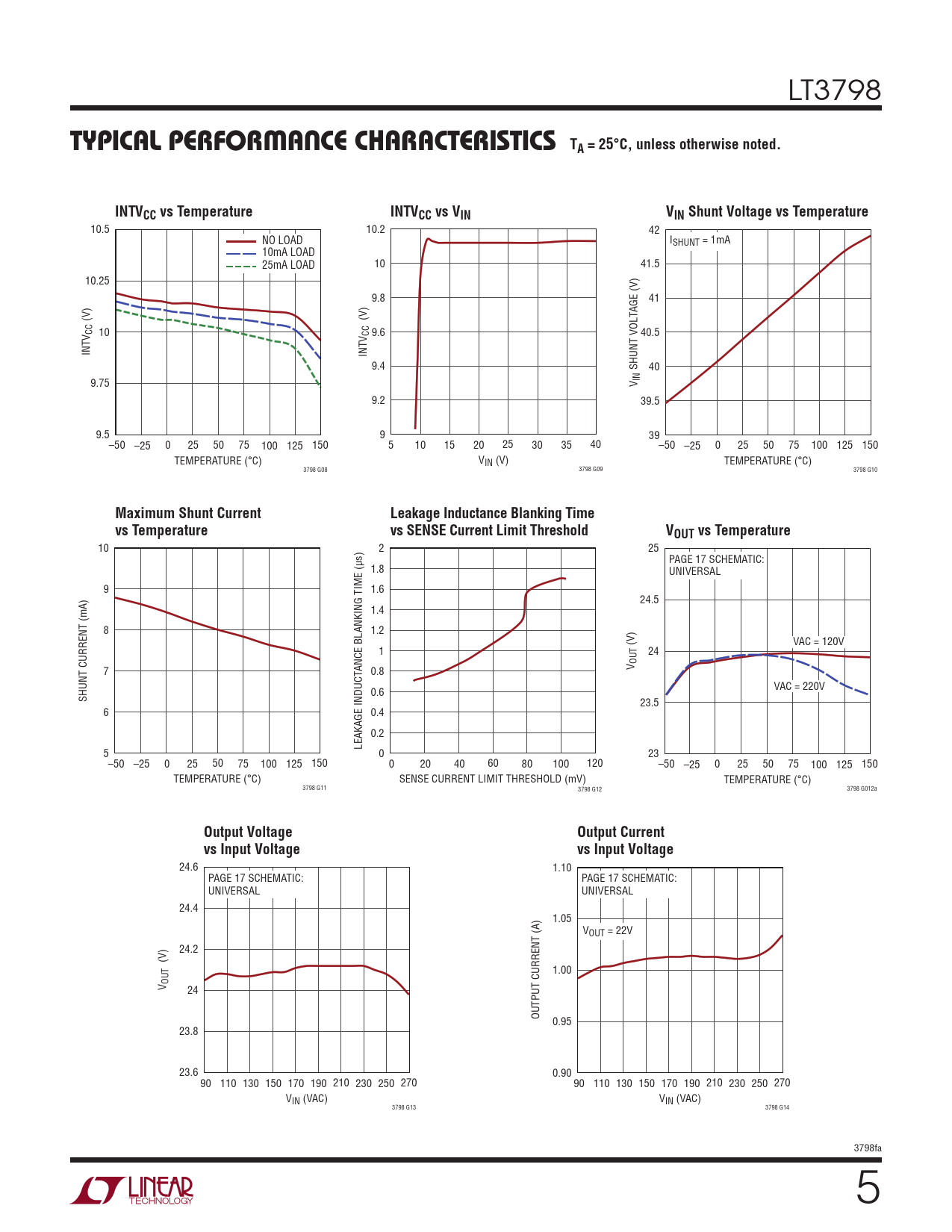 10 2 25 PAGE 17 SCHEMATIC: 1.8 UNIVERSAL 9 1.6 24.5 1.4 8 1.2 (V) VAC = 120V 1 24 7 0.8 V OUT VAC = 220V SHUNT CURRENT (mA) 0.6 23.5 6 0.4 0.2 LEAKAGE INDUCTANCE BLANKING TIME (µs) 5 0 23 –50 –25 0 25 50 75 100 125 150 0 20 40 60 80 100 120 –50 –25 0 25 50 75 100 125 150 TEMPERATURE (°C) SENSE CURRENT LIMIT THRESHOLD (mV) TEMPERATURE (°C) 3798 G11 3798 G12 3798 G012a